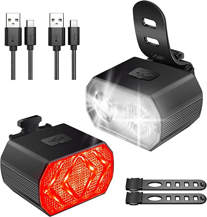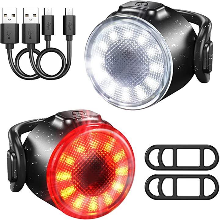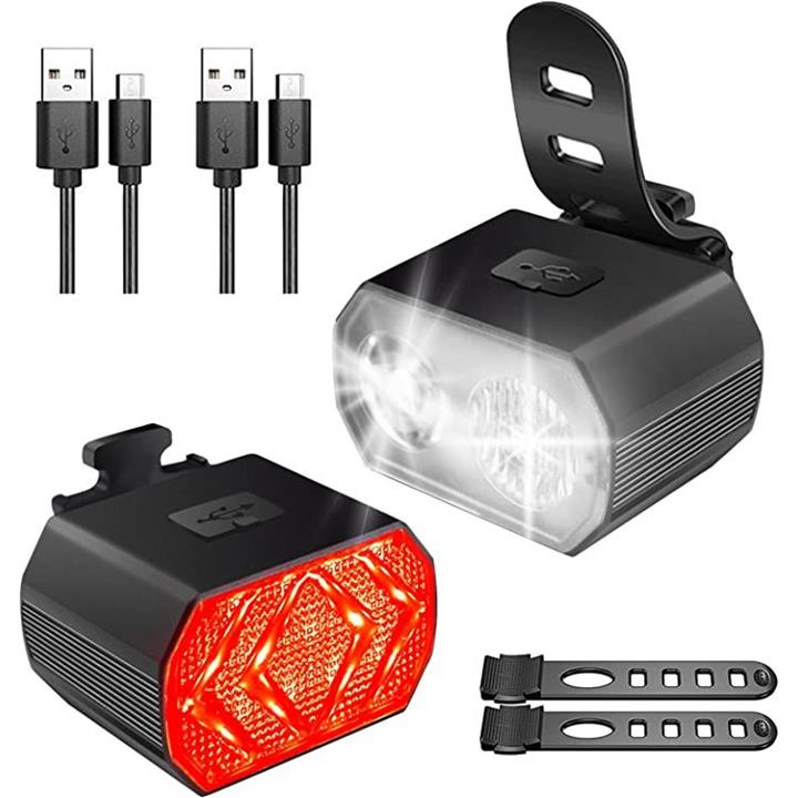 「自転車用ヘッド&テールライトのオトクなセット」セット内容:自転車用テールライトx1、自転車用ヘッドライトx1、充電ケーブルx2、取り付けストラップx2,予備ストラップx2。