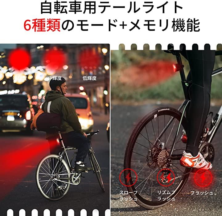 テールライトの赤色光は6つの点灯モード(強-中-点滅-速い点滅-警告点滅-遅い点滅)があります。