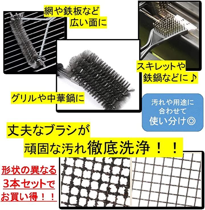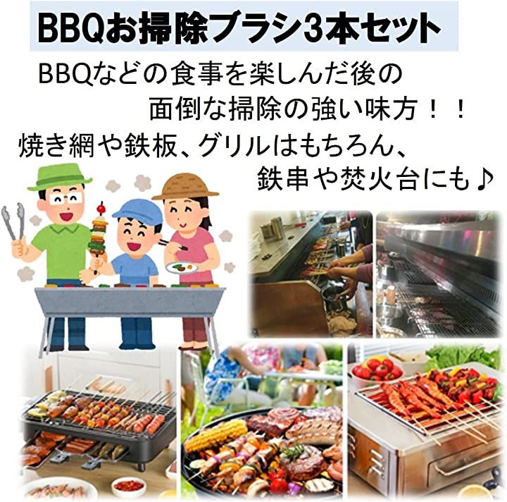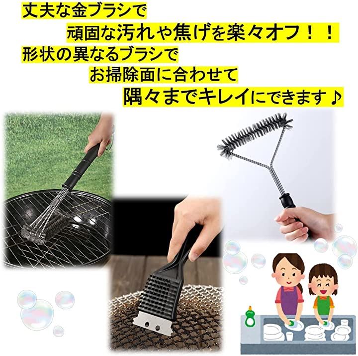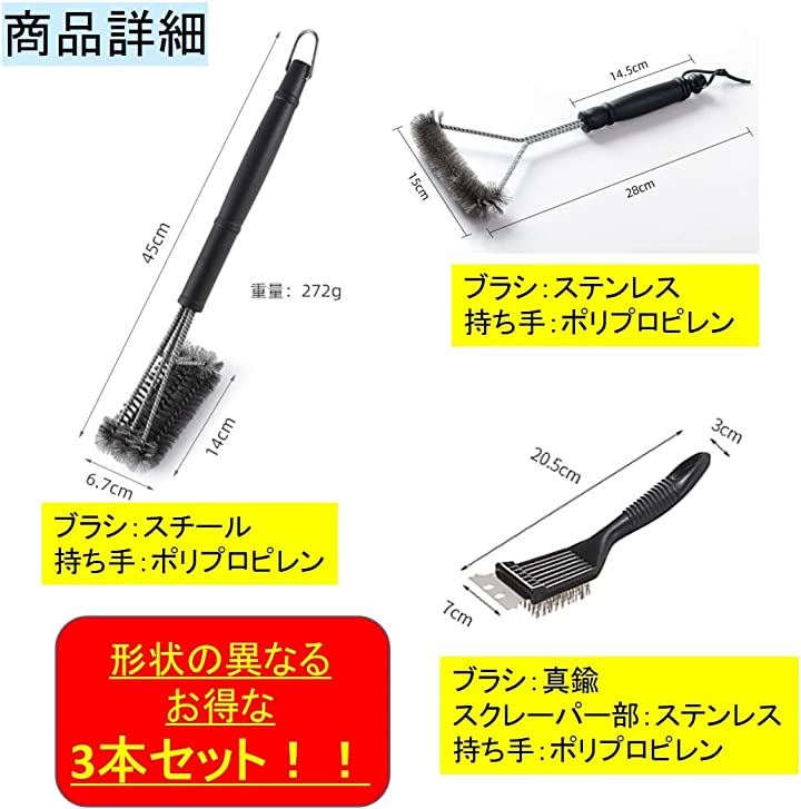 バーベキューブラシ グリルブラシ 3点セット 網 鉄板用 キャンプ BBQ ギア ツール 金ブラシ 掃除 スクレーパー