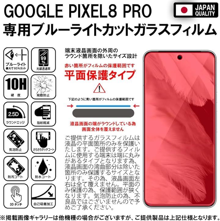 指紋認証対応版2枚セットフィルム Google Pixel 8 Pro 用 ガラスフィルム ブルーライトカット 93% 強化 高透過 高光沢 日本製 旭硝子 0.26mm 硬度10H 2.5Dラウンドエッジ 自動吸着 気泡ゼロ 飛散防止 指紋防止 撥水撥油 3D タッチ