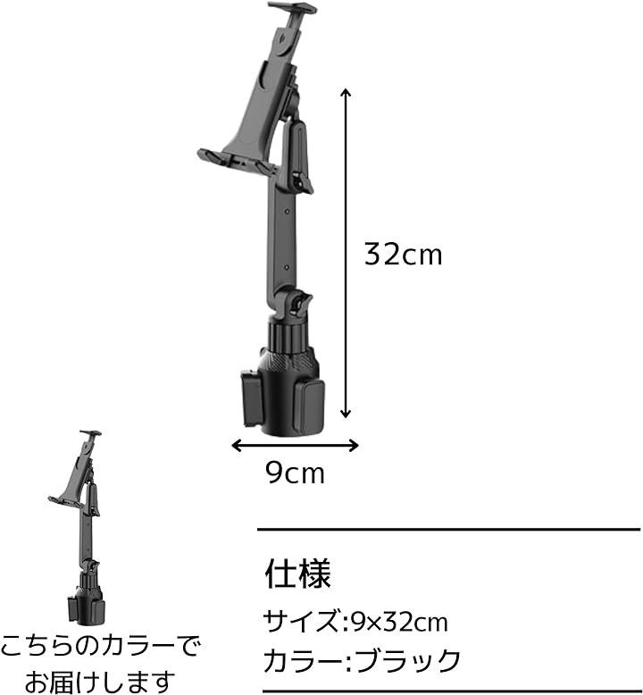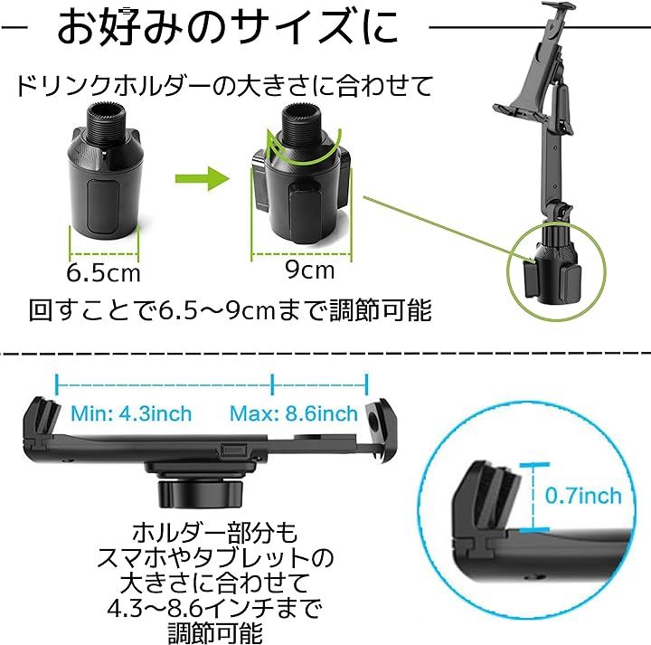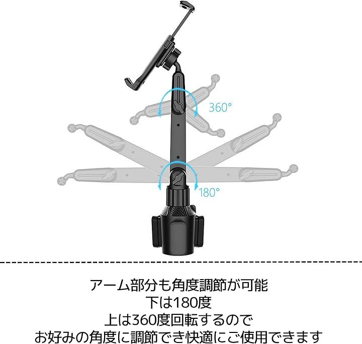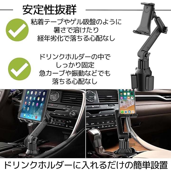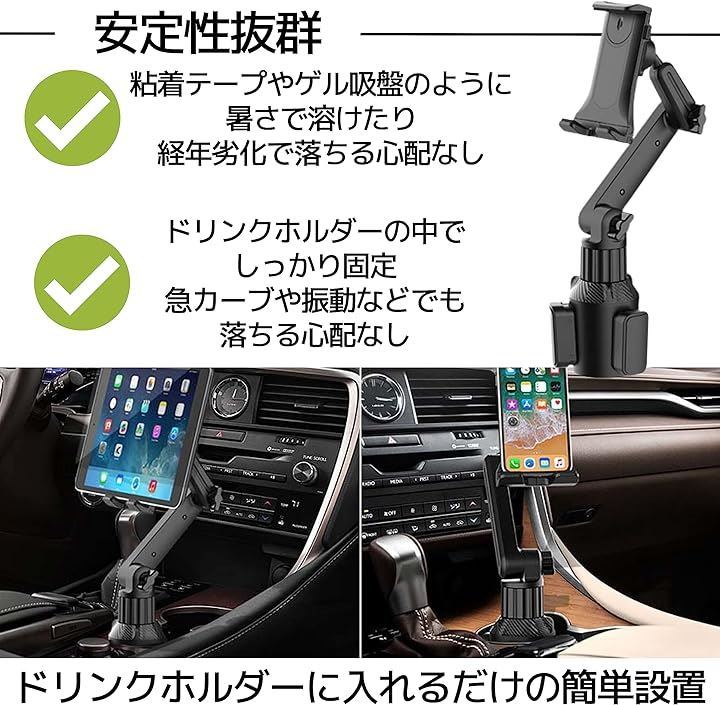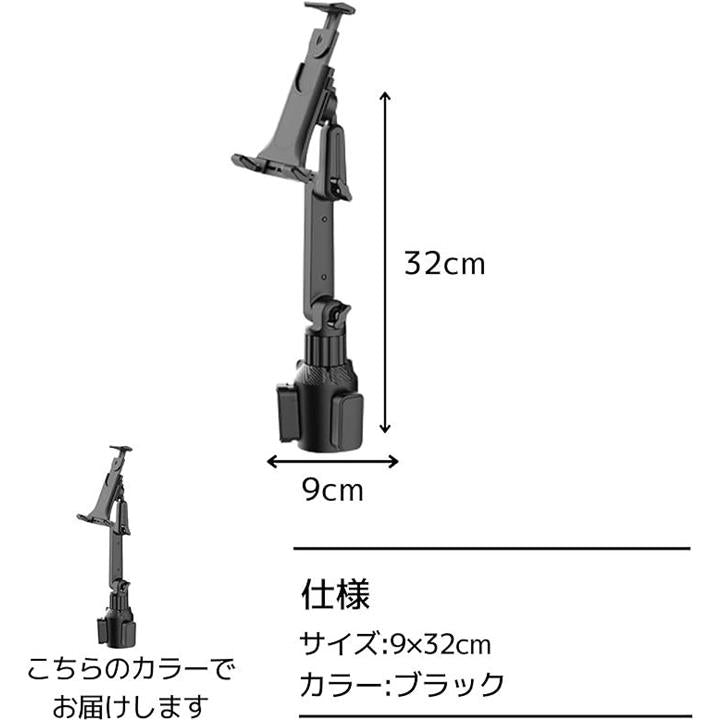 タブレット・スマホホルダー 車載 伸縮 角度調整可能 360度回転 ドリンクホルダー 取り付け簡単