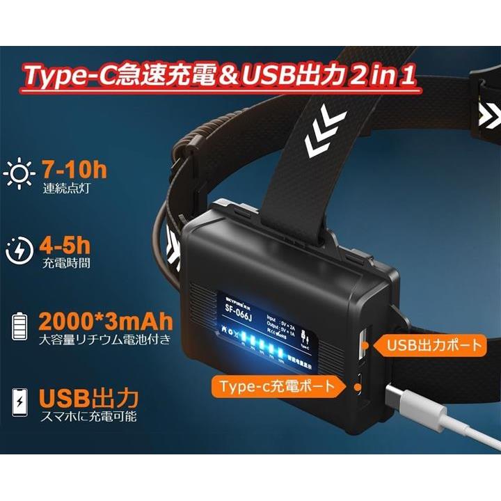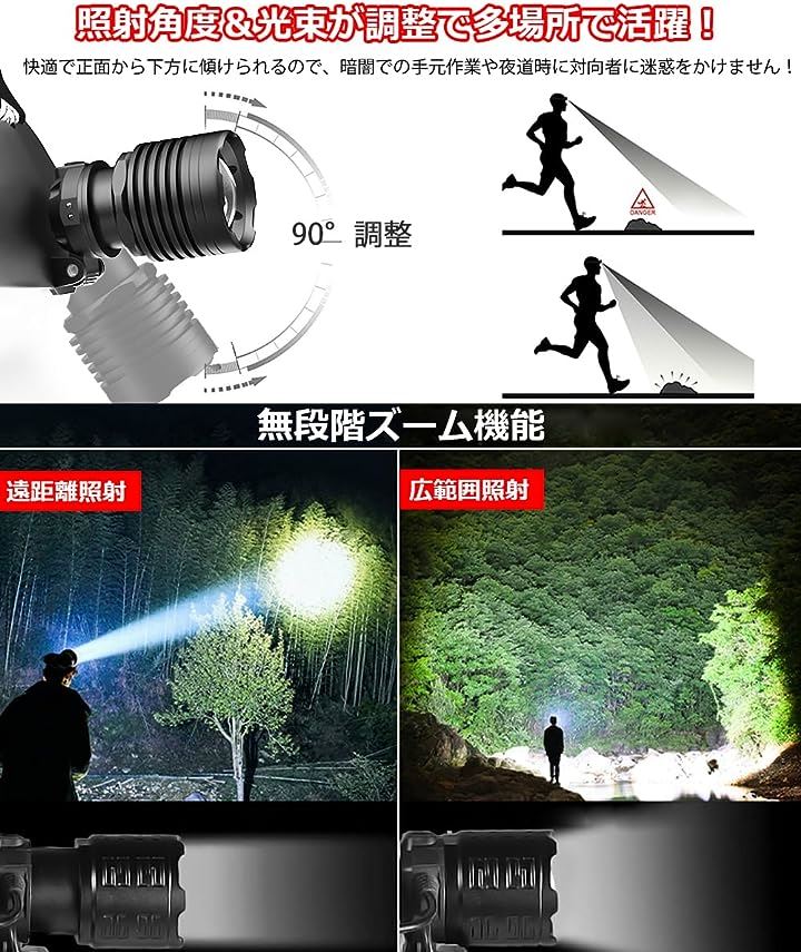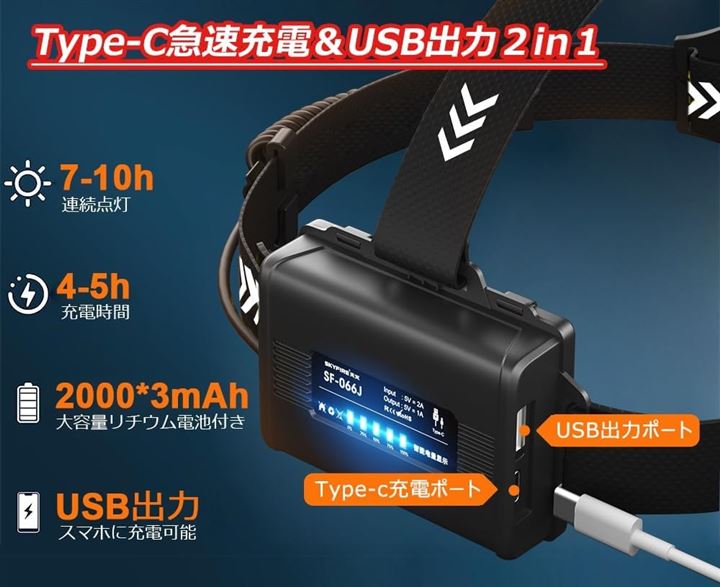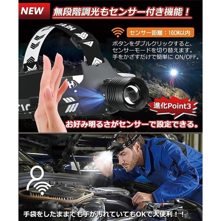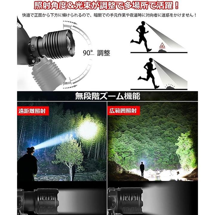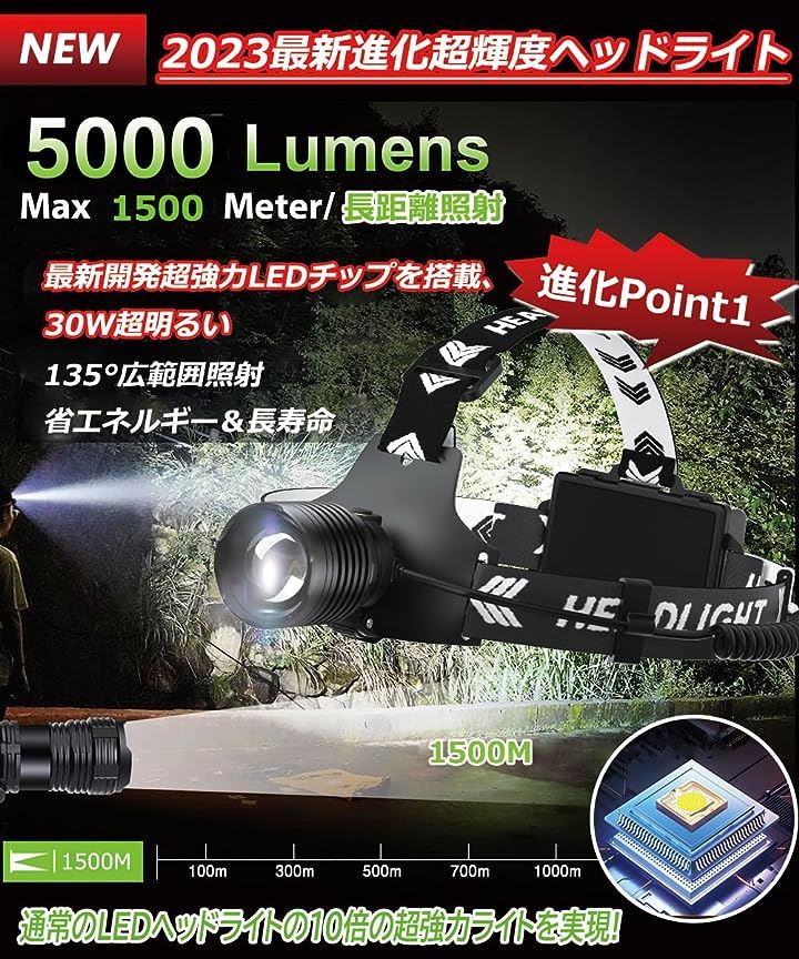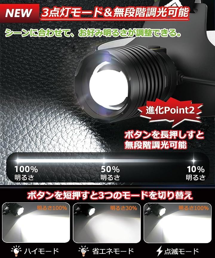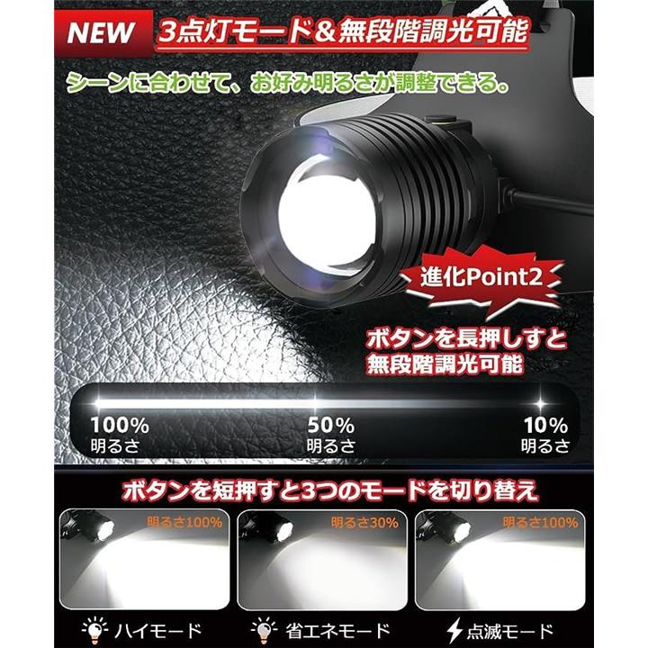 ヘッドライト 充電式 LED 無段階調光 高輝度 5モード ライト電池付き |