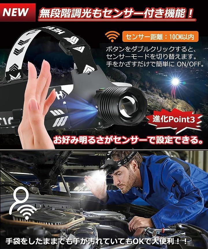 LEDヘッドライトの右(15cm以内)で手を振くとライトを点灯、消灯することができます。