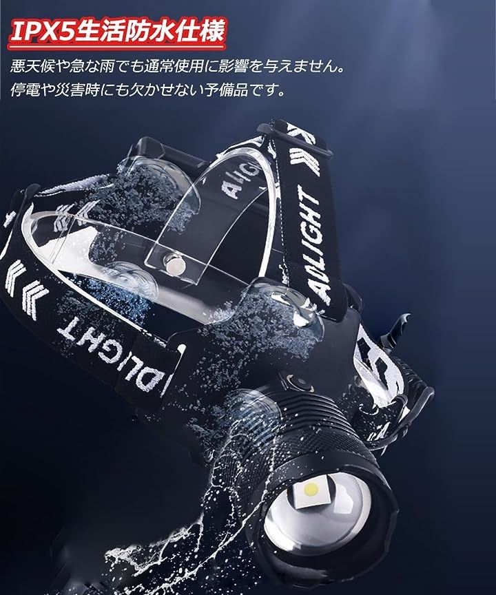 LEDヘッドライトはIPX5防水デザインなので、日常生活の雨水などによる水滴の付着や飛沫程度ならば、ヘッドライトに悪影響なく動作します。