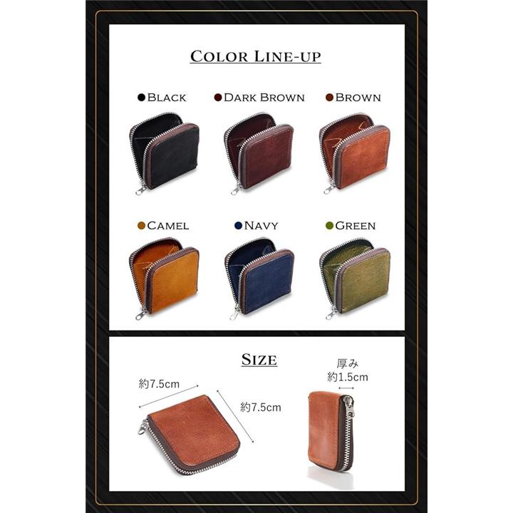 「商品詳細」*サイズ:約7.5cmx約7.5cmx約1.5cm *カラー:(1)ブラック(2)ダークブラウン(3)ブラウン(4)キャメル(5)グリーン(6)ネイビー *用途:メンズ・レディース小銭入れ、小物入れ、コインケース、こぜにいれ、小銭いれ、小さい財布 *商品は環境保全のため簡易包装にてお届けいたします。