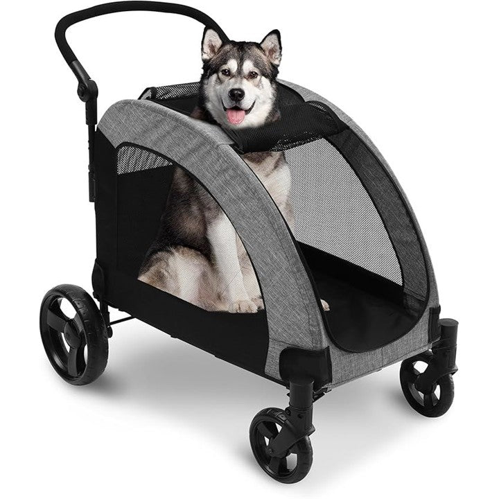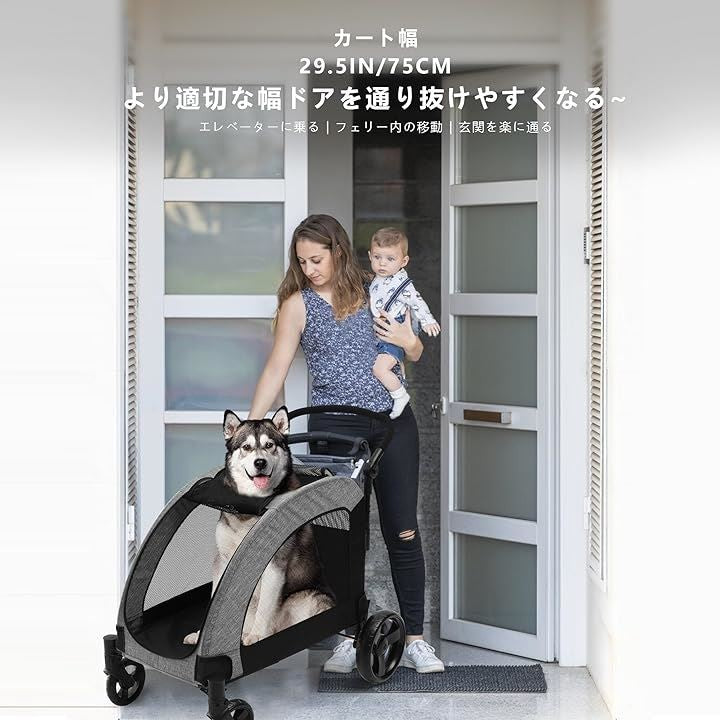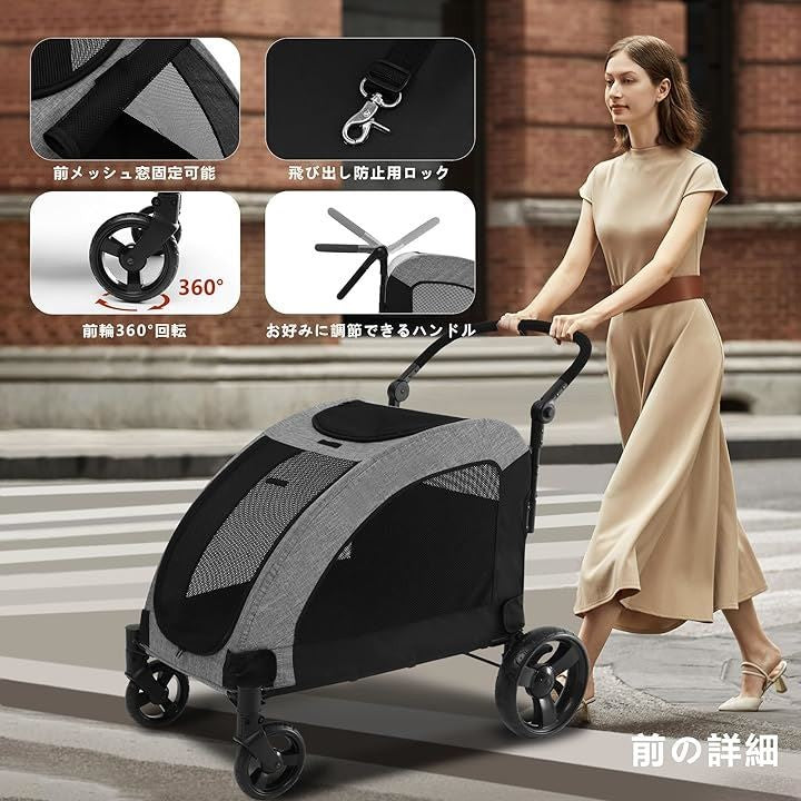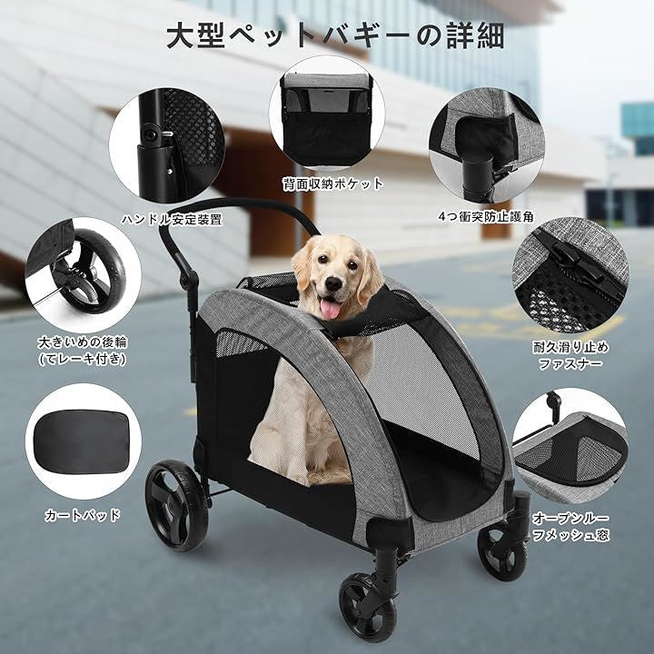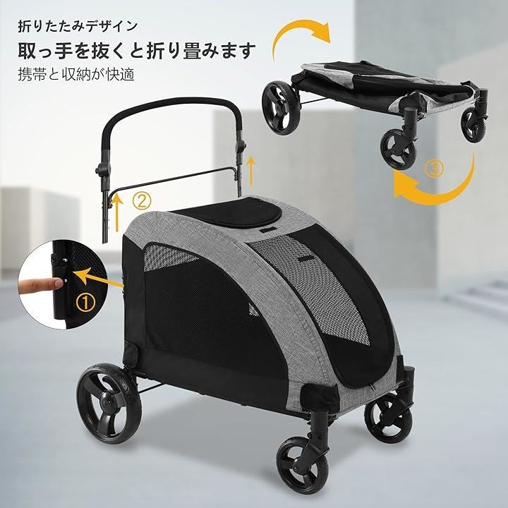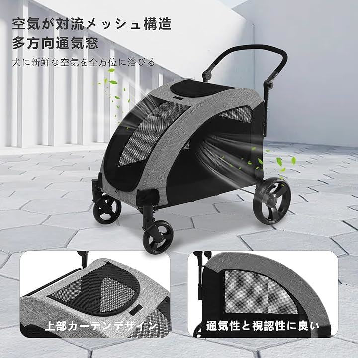 ペットカート 大型犬 バギー 折りたたみ式 耐荷重50kg 多頭中型犬 犬用ベビーカー 通気性アップ ブレーキ機能 4輪 お出かけ 乗り降りラクラク グレー