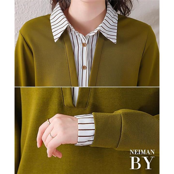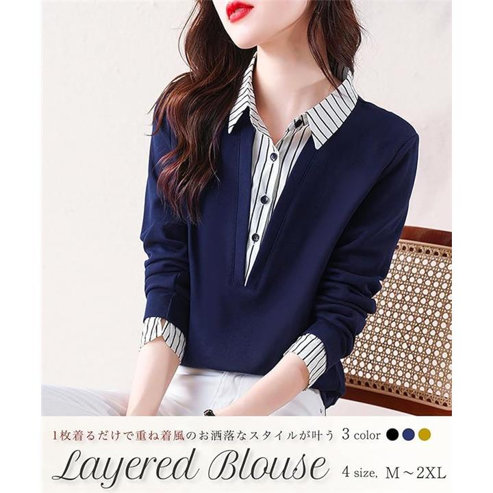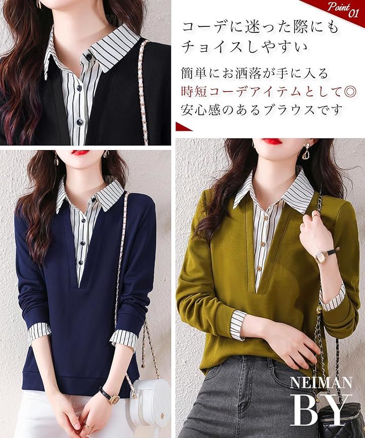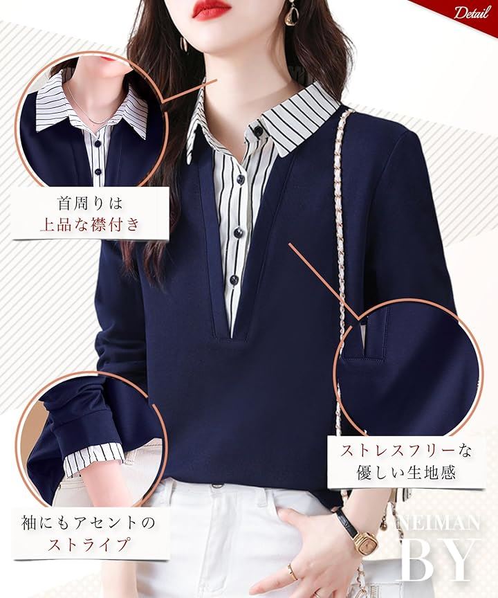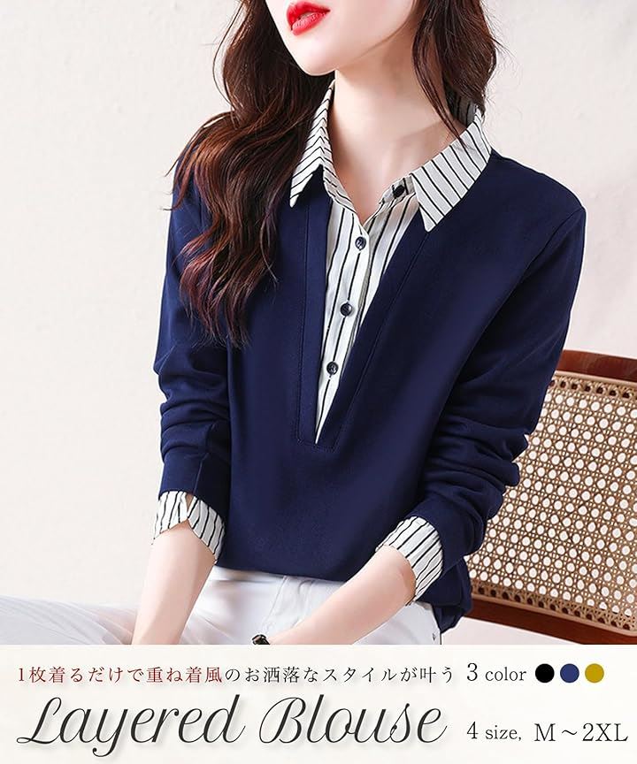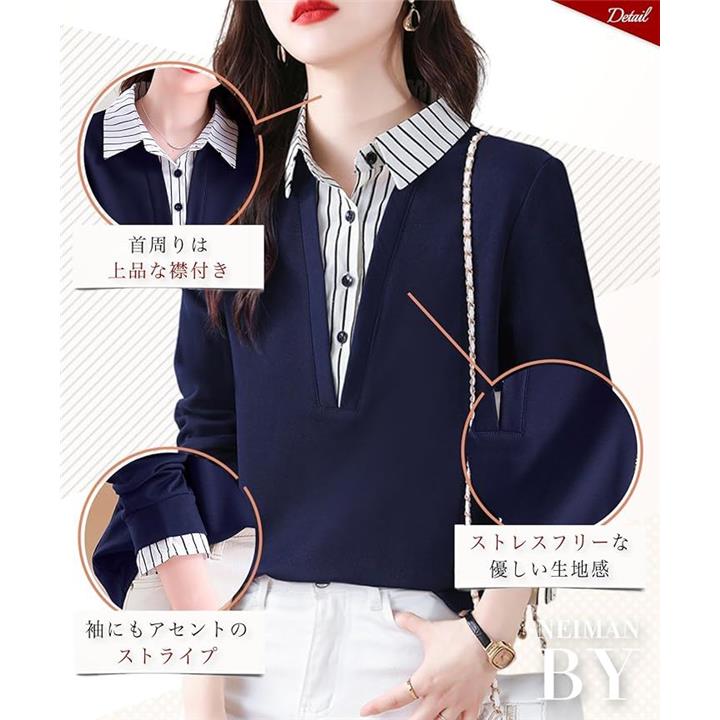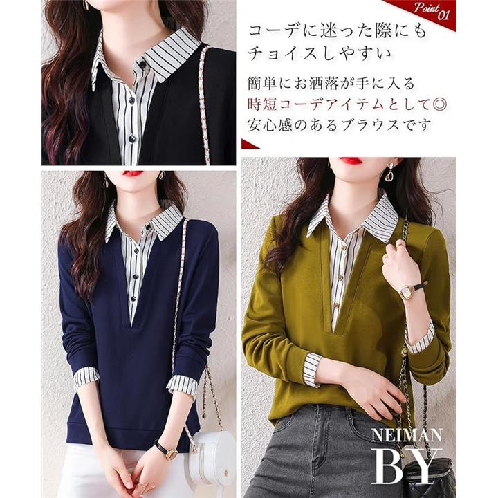 [ニーマンバイ] フェイク レイヤード シャツ ブラウス ストライプ 重ね着風 きれいめ カジュアル 春秋 春物カットソー レディス 袖コンシャス レディース長袖 ワイシャツ お呼ばれ |