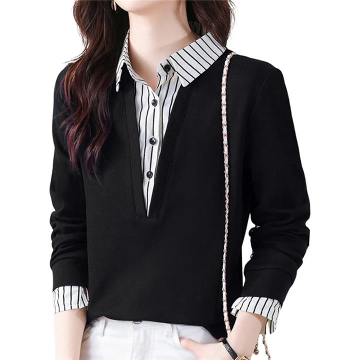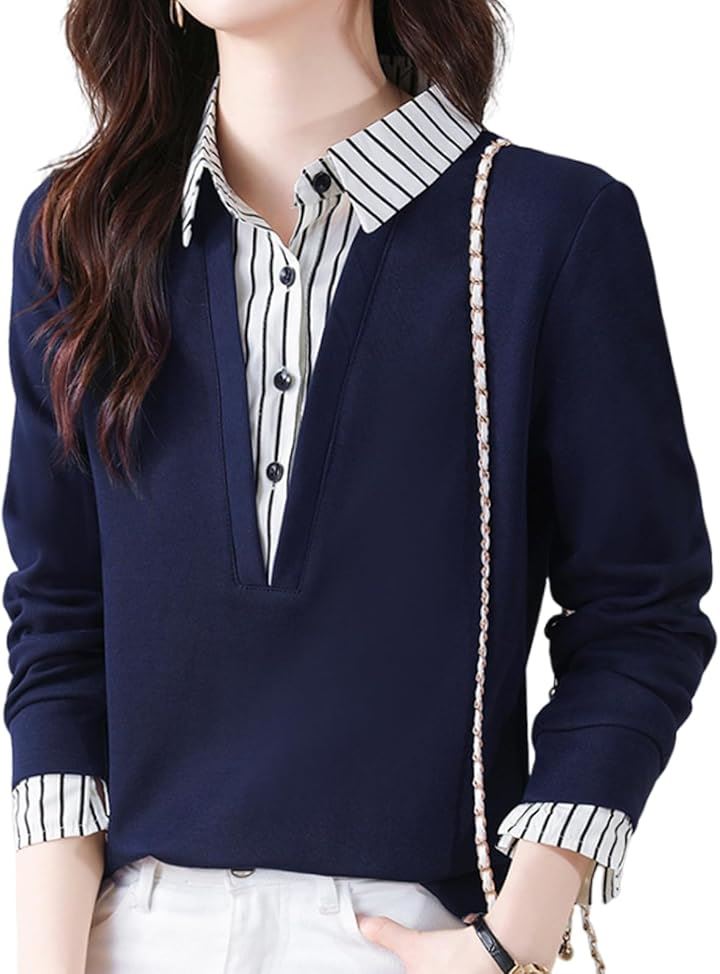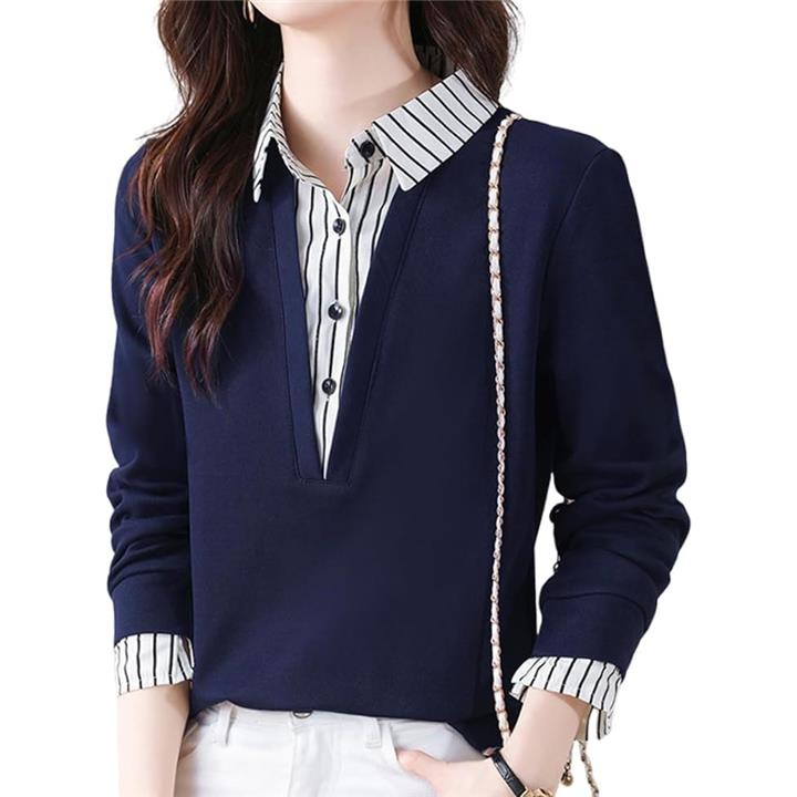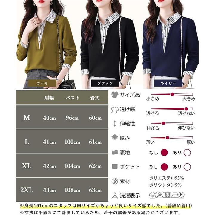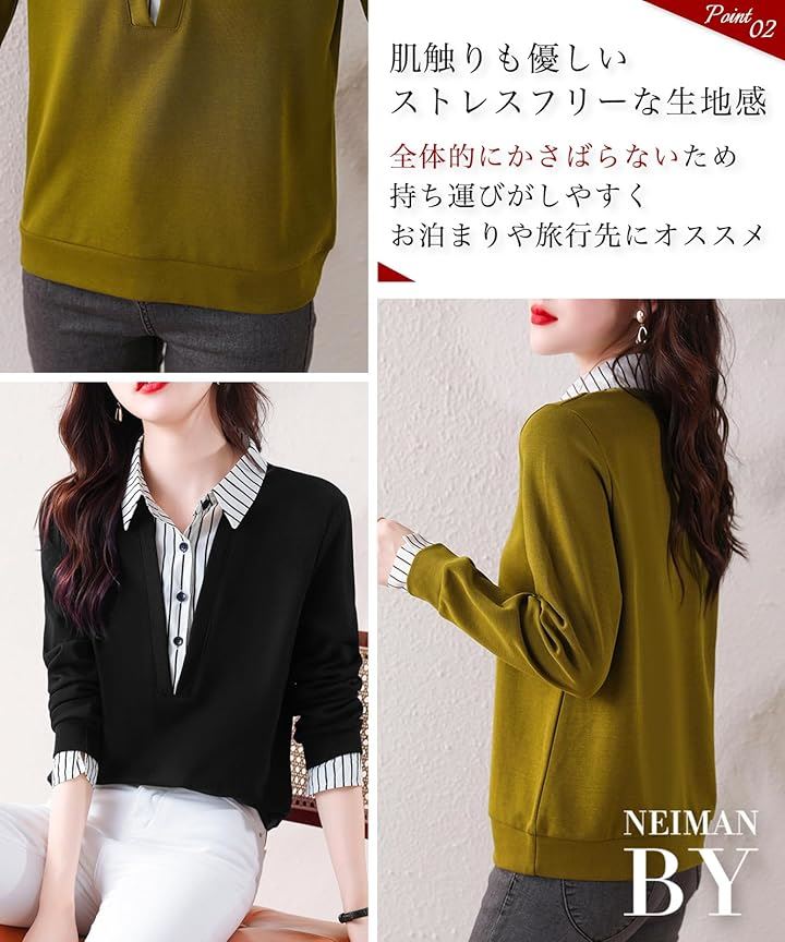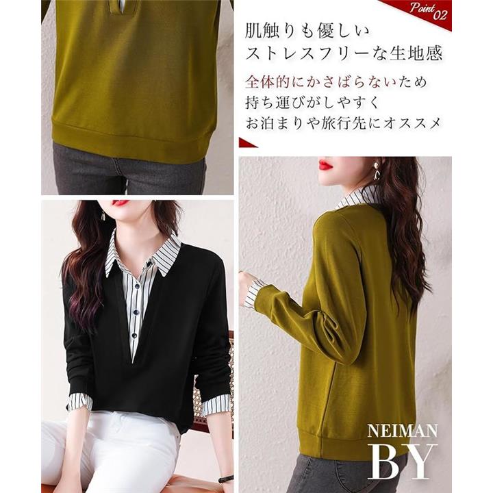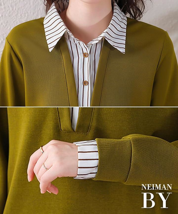[ニーマンバイ] フェイク レイヤード シャツ ブラウス ストライプ 重ね着風 きれいめ カジュアル 春秋 春物カットソー レディス 袖コンシャス レディース長袖 ワイシャツ お呼ばれ |
