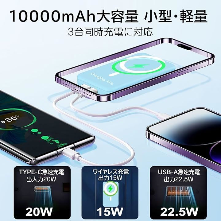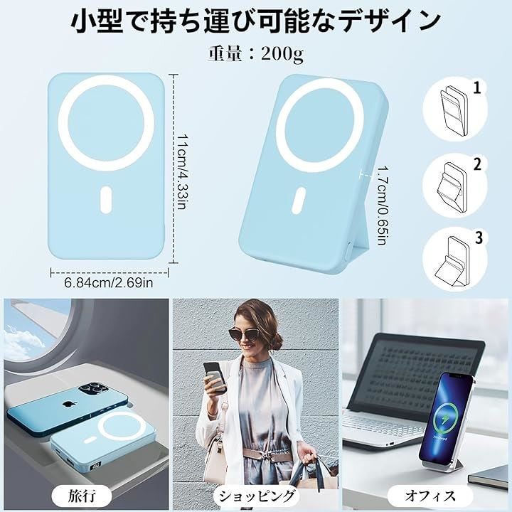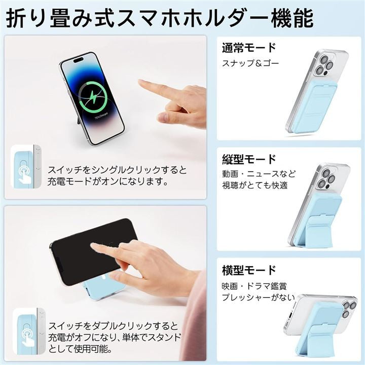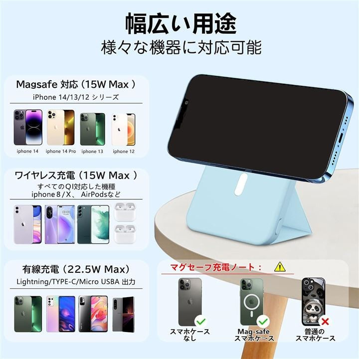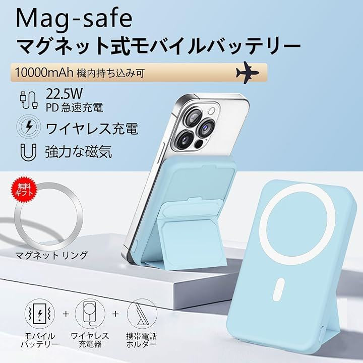 LUCKYDUO Magsafeモバイルバッテリー マグネット10000mAh 大容量 急速充電 ワイヤレス モバイルバッテリー折りたたみ式スタンド 「15W ワイヤレス充電/22.5W USB 出力/PD対応」3台同時充電 持ち運び便利 PSE認証済み 日本語取扱書付き(ブルー) |