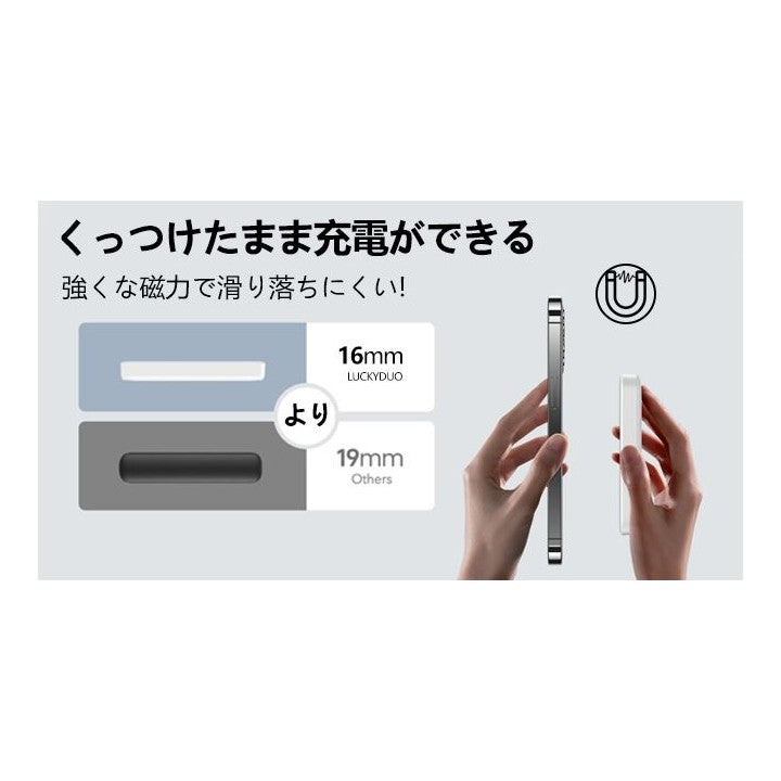 「くっつけたまま充電ができる& 急速充電」LUCKYDUOワイヤレス マグネット モバイルバッテリーは、独自のMag-N-Goテクノロジー(強磁力高速ワイヤレス充電)によるiPhone 15/14/13/12シリーズ専用のワイヤレス充電を搭載。