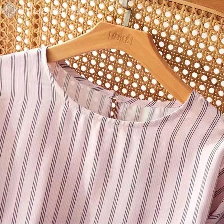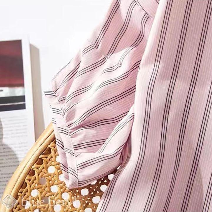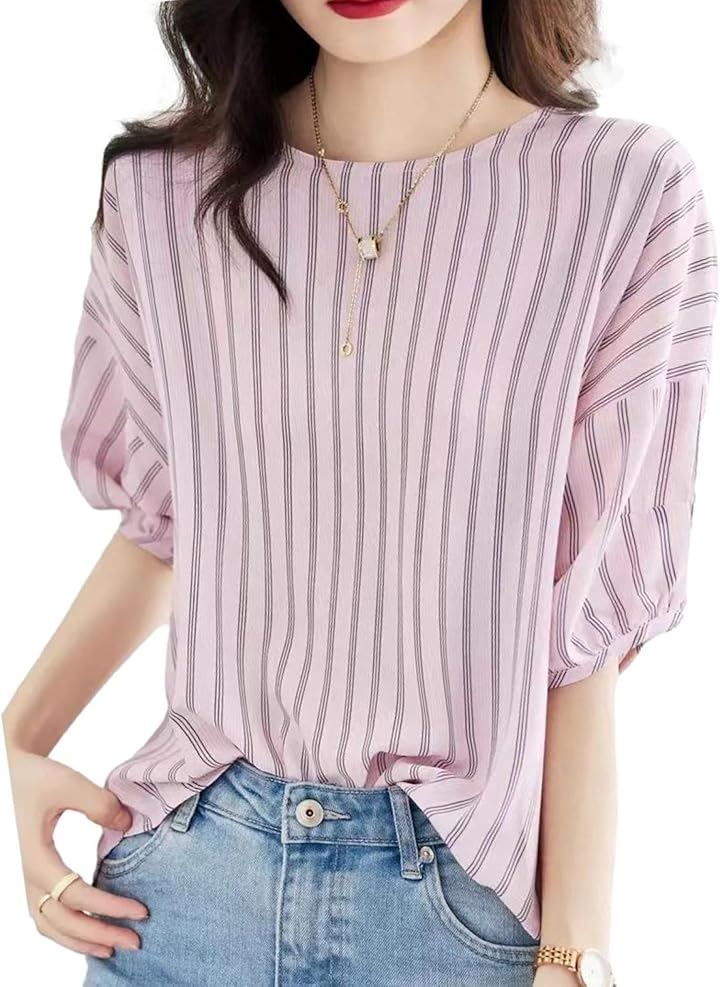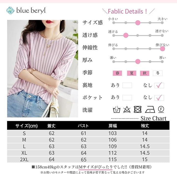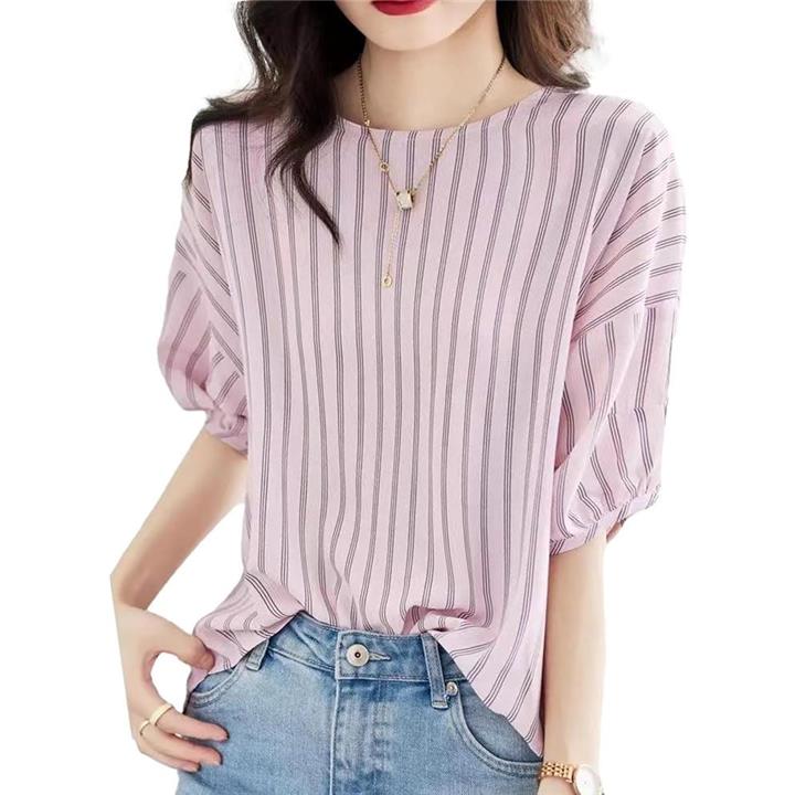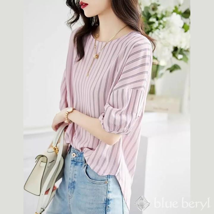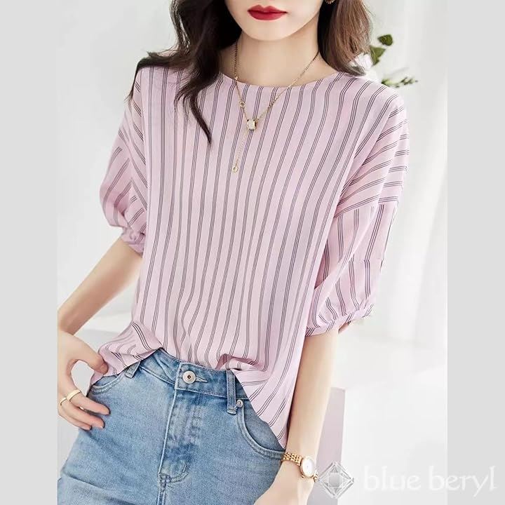 ブルーベリル ブラウス レディース ストライプ柄 ボリューム袖 5分袖 ラウンドネック プルオーバー ゆったり ピンク BB029
