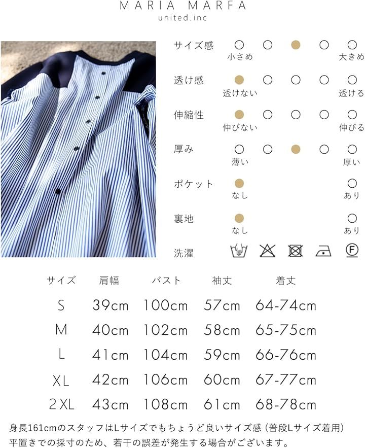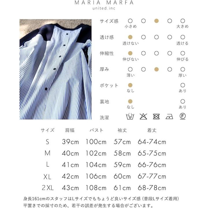 サイズ:肩幅/バスト/袖丈/着丈前-後 「S」39/100/57/64-74 「M」40/102/58/65-75 「L」41/104/59/66-76 「XL」42/106/60/67-77 「2XL」43/108/61/68-78