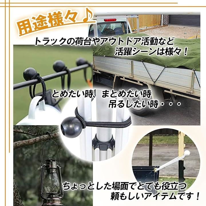 トラックシートの固定、荷物の仮留め、固定用にはもちろん、キャンプで使うテントのタープクッションコードとして、天幕、テントなどのアウトドア用品、照明ライプ、カーテン、サッカーネット、バラソル、コンセントやコード類など。