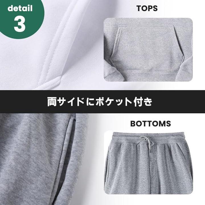 メンズ・レディース兼用のスウェットスーツで、パーカーとパンツがセットになった実用的なアイテムです。