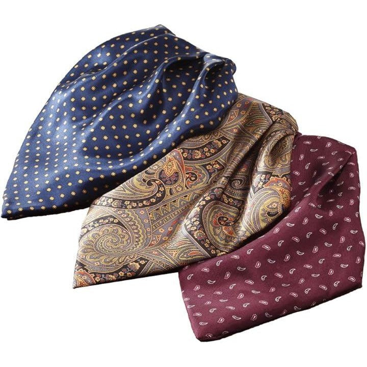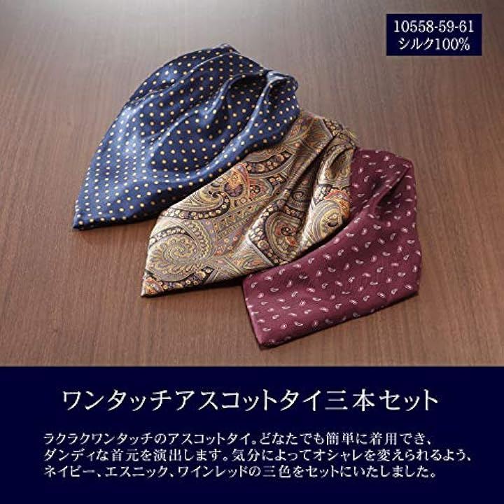 ワンタッチ シルク アスコットタイ 3枚セット ワインレッド ネイビー エスニック柄 ダンディ 10558-59-61