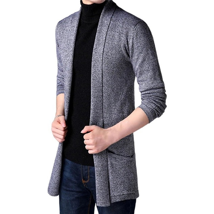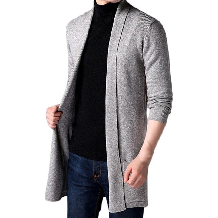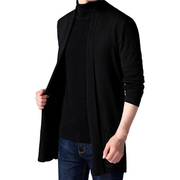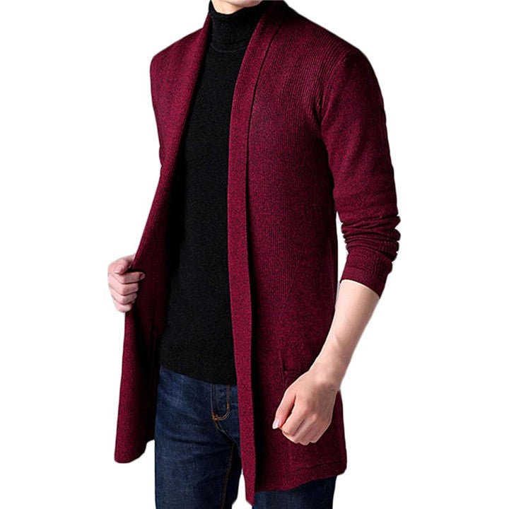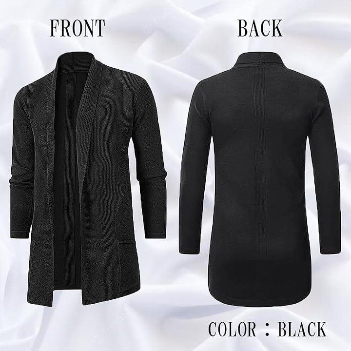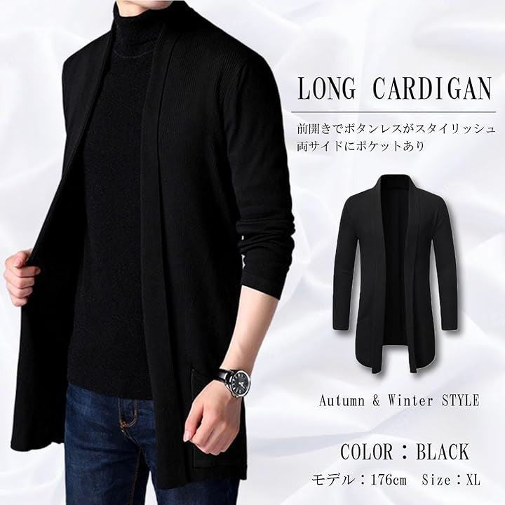 メンズ用 カーディガン、スリムに見せるシルエットがかっこいい、丈の長めな ロングカーディガンです。