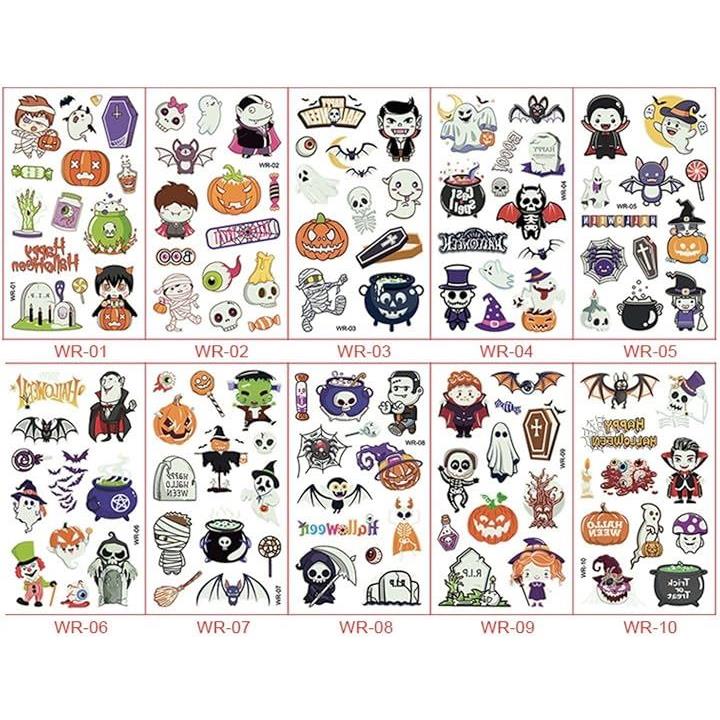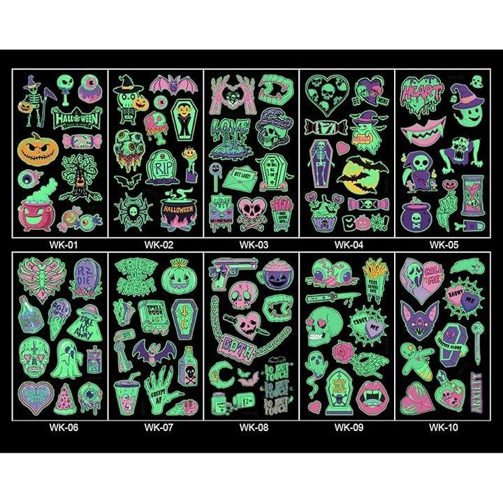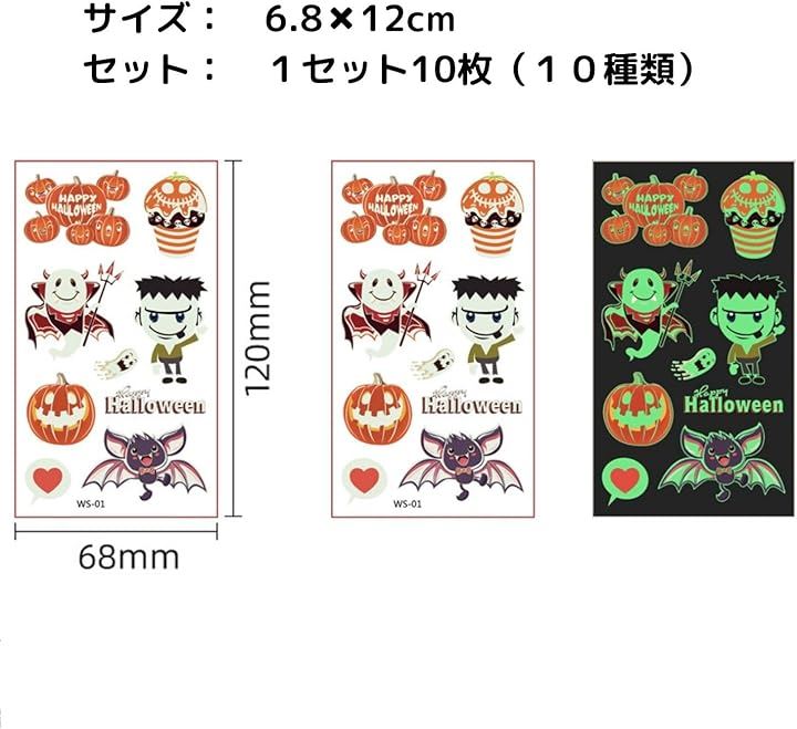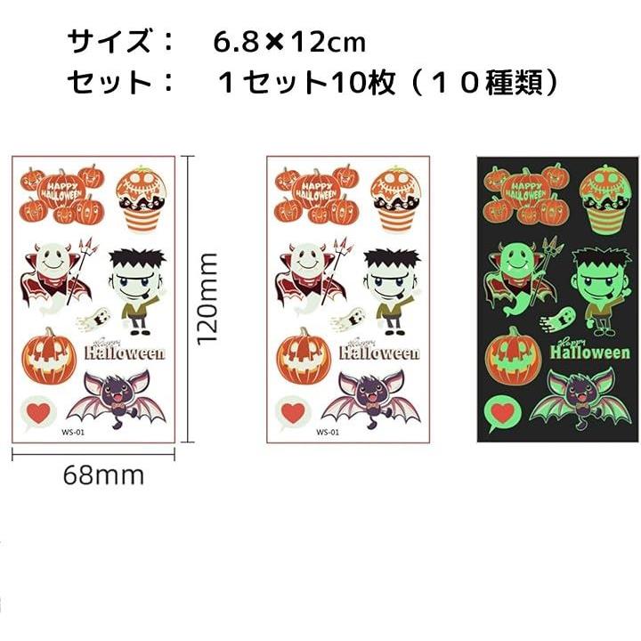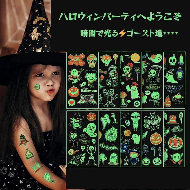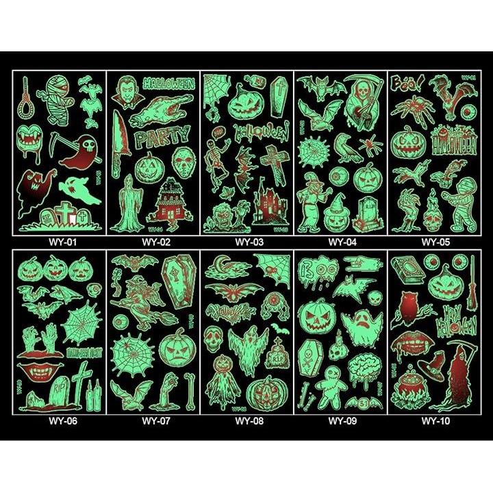 ハロウィン 夜光 蛍光 タトゥー シール 10枚セット 4種類 ステッカー ボディフェイス 仮装 コスプレ 光る お化け 図柄