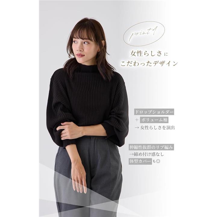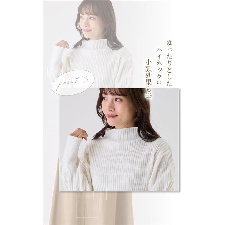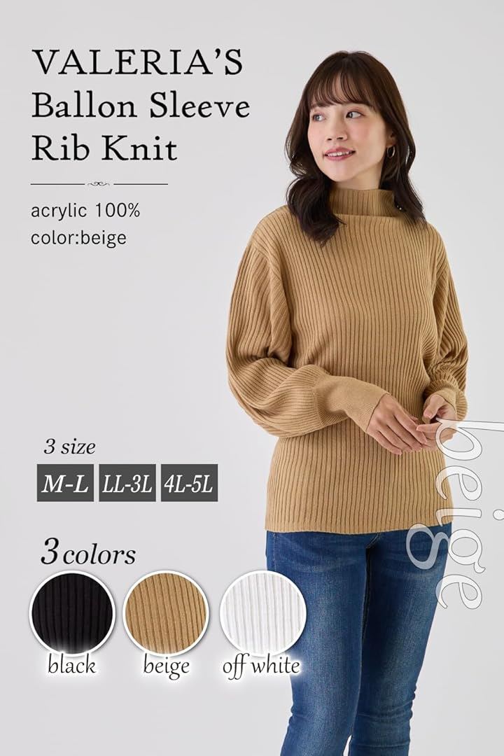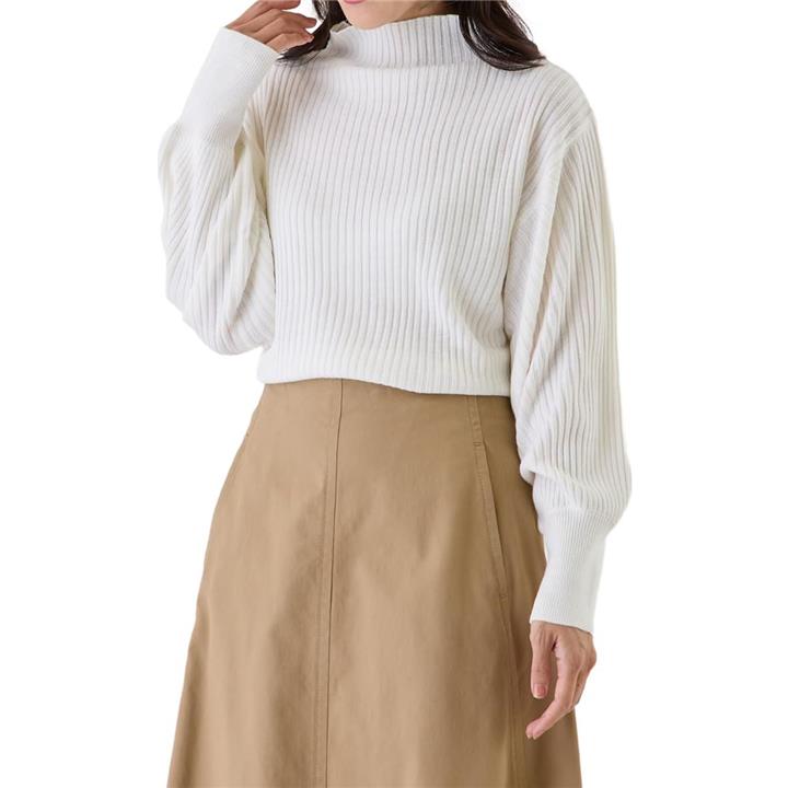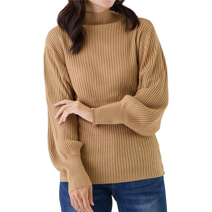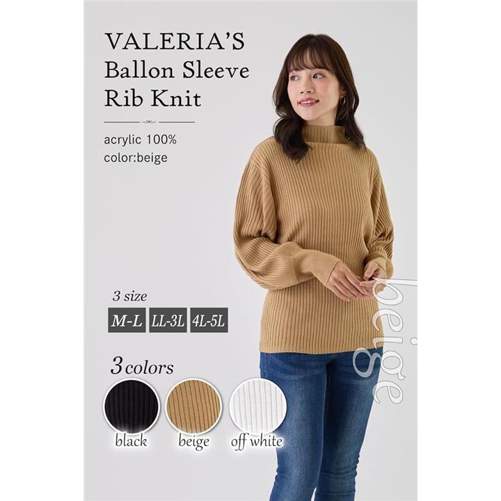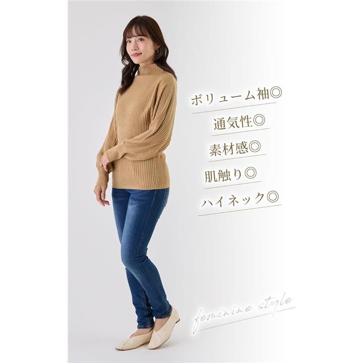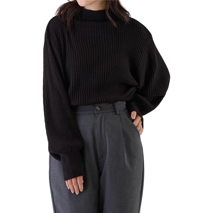 バレリア リブニット トップス ハイネック 長袖 バルーンスリーブ ニットセーター レディース ゆったり 春秋 オシャレ シンプル プルオーバー