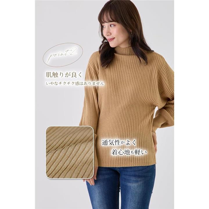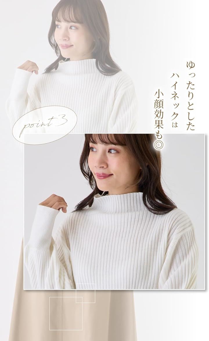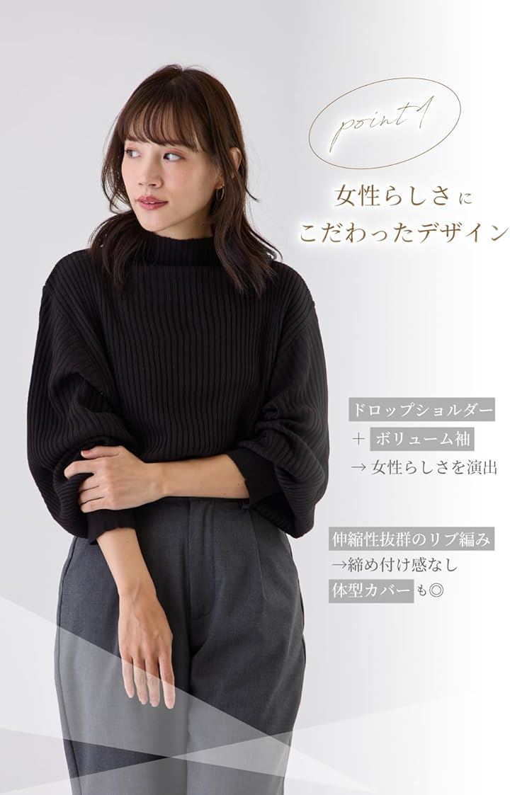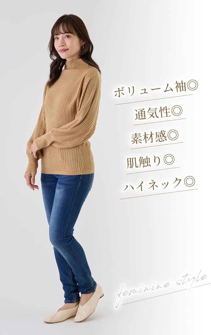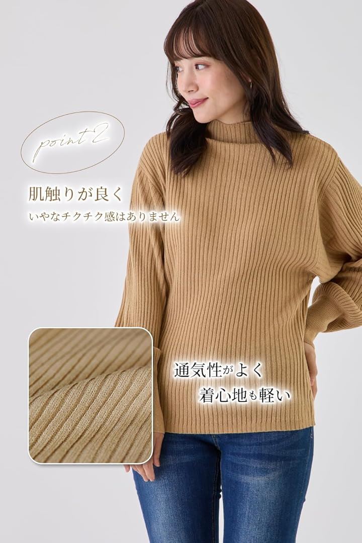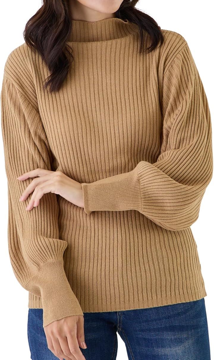 バレリア リブニット トップス ハイネック 長袖 バルーンスリーブ ニットセーター レディース ゆったり 春秋 オシャレ シンプル プルオーバー