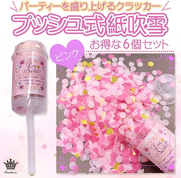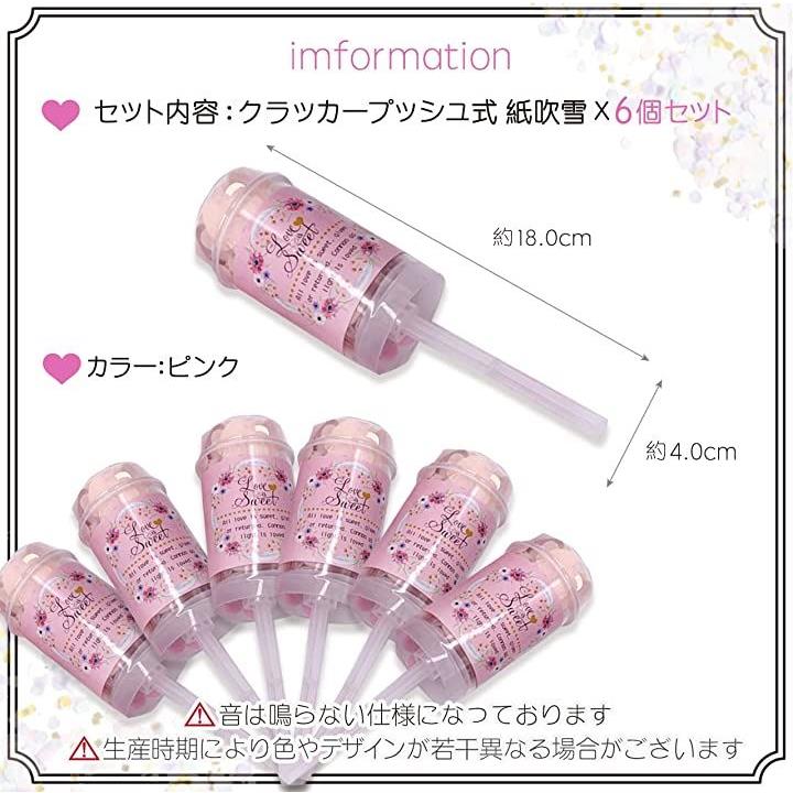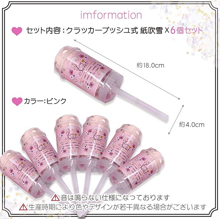 「商品仕様」セット内容:クラッカー プッシュ式 紙吹雪 x6個セット カラー:ピンク サイズ:約4.0cmx18.0cm *音は鳴らない仕様になっております。