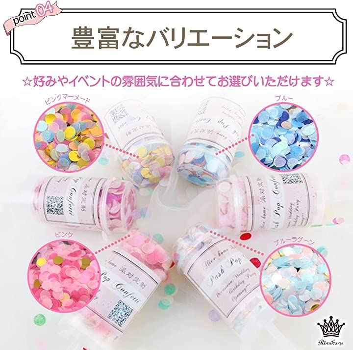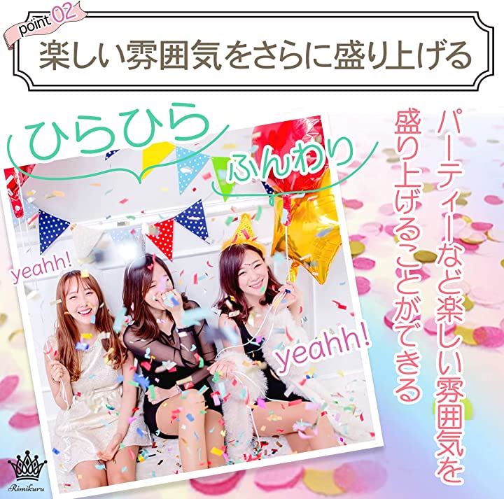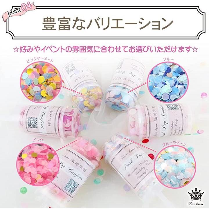 楽しい雰囲気をさらに盛り上げる:カラフルでかわいい紙吹雪の入ったパーティー クラッカーなのでひらひら、ふんわりと舞う紙吹雪が結婚式や誕生日、パーティーなど楽しい雰囲気をより盛り上げることができるでしょう。