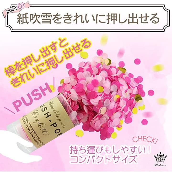 紙吹雪をきれいに押し出せる:こちらのパーティー クラッカー 紙吹雪はプラスチックのプッシュ式のケースに入っているので、棒をグッと押し出すと紙吹雪をふんわりと、きれいに押し出すことができます。