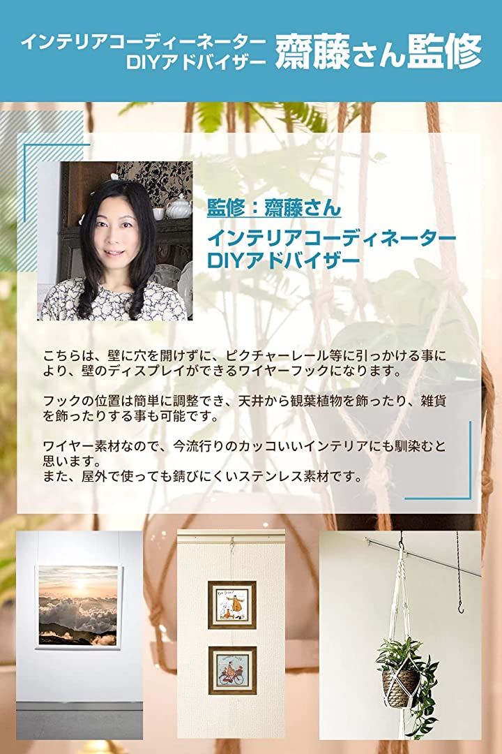「使用方法」使用方法は非常にシンプルで、ワイヤーの上部レールフックなどにを引っかけ、ピクチャーフックを額縁の裏に引っ掛けるだけです。