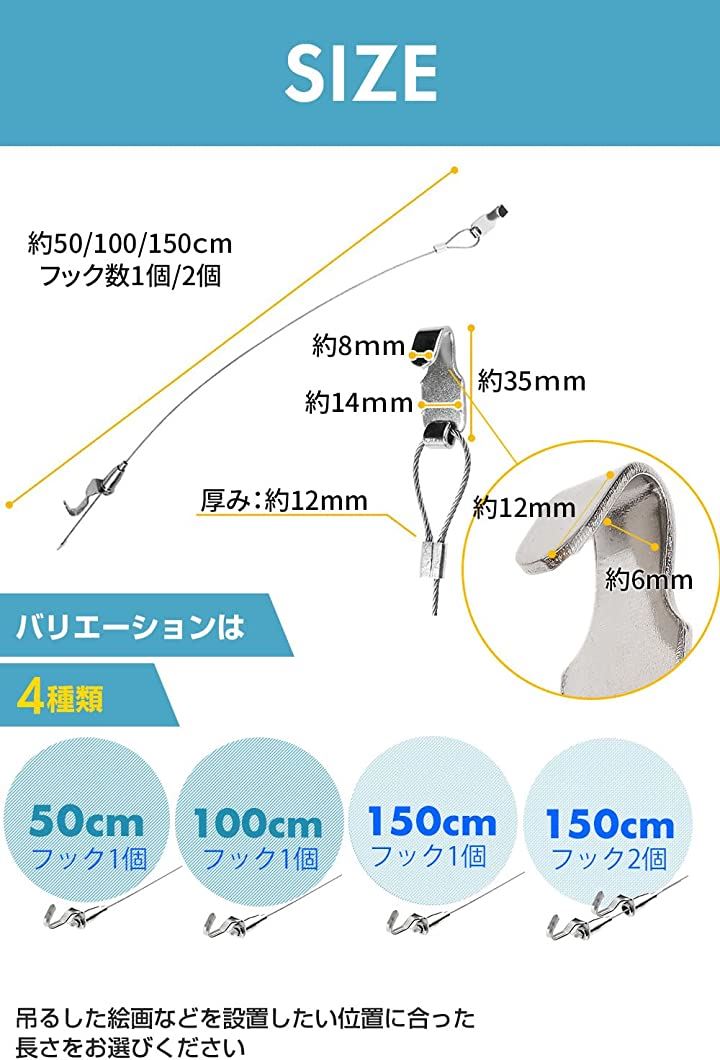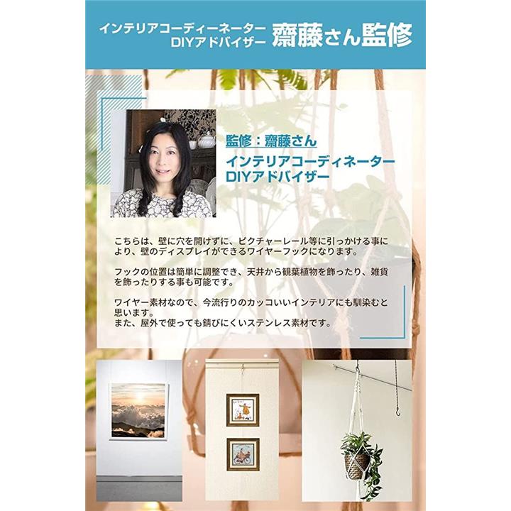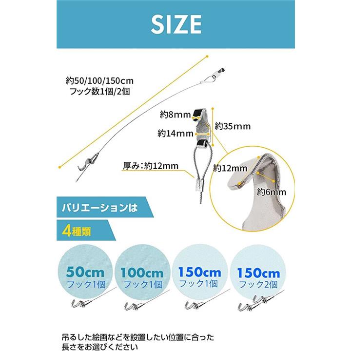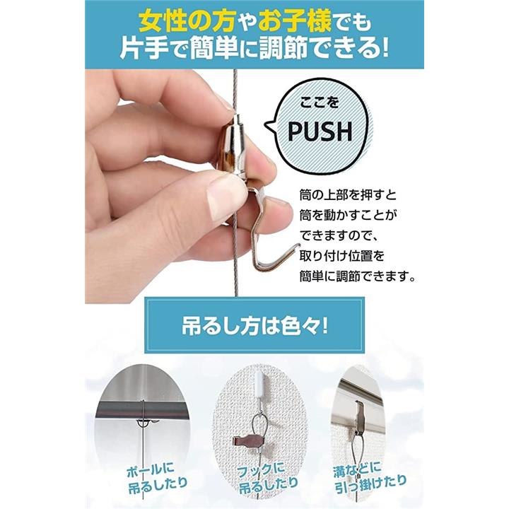 「製品性能」長さ0.5m~1.5mのステンレス製ワイヤーは、優れた防錆性と耐久性を備えており、使用荷重は約40kgです。