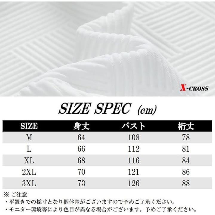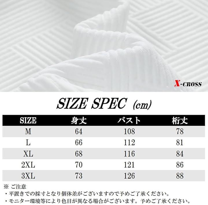 「Mサイズ」バスト:108cm 身丈:64cm 桁丈:78cm 「Lサイズ」バスト:112cm 身丈:66cm 桁丈:81cm 「XLサイズ」バスト:116cm 身丈:68cm 桁丈:84cm 「2XLサイズ」バスト:121cm 身丈:70cm 桁丈:86cm 「3XLサイズ」バスト:126cm 身丈:73cm 桁丈:88cm