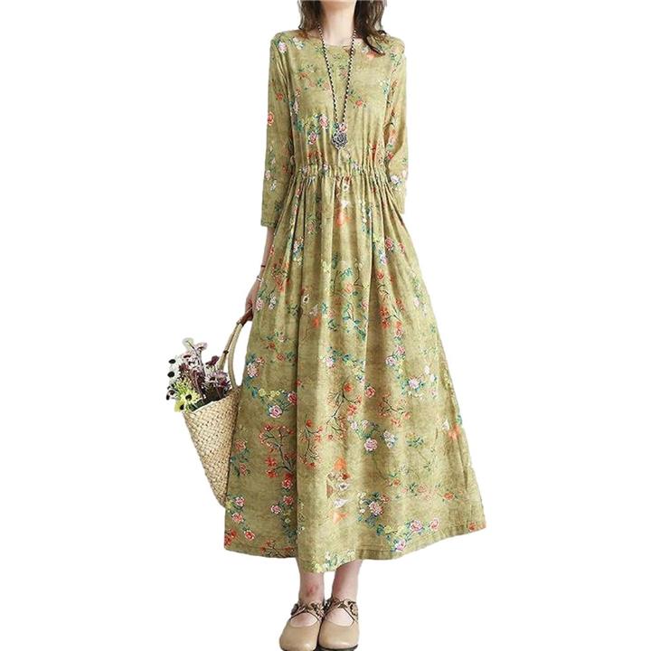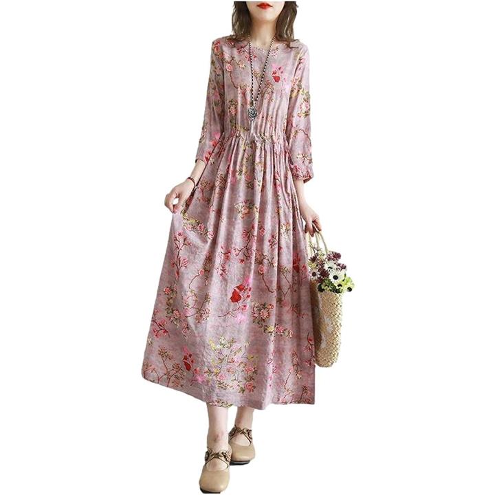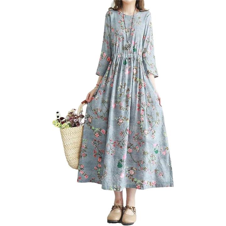 レトロな花柄が好印象*夏らしく袖の長さは7分丈にしつつも、裾は大胆なマキシ丈に仕上げました。