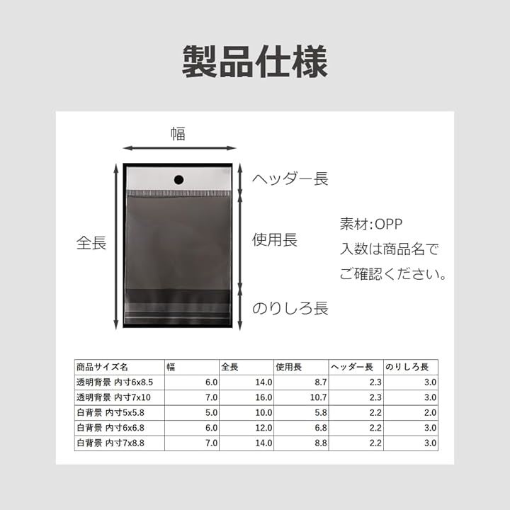 OPP袋 ヘッダー テープ付き 穴あき 透明袋 フック用 200枚入