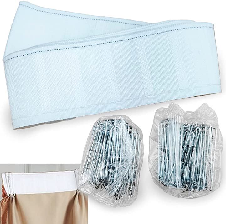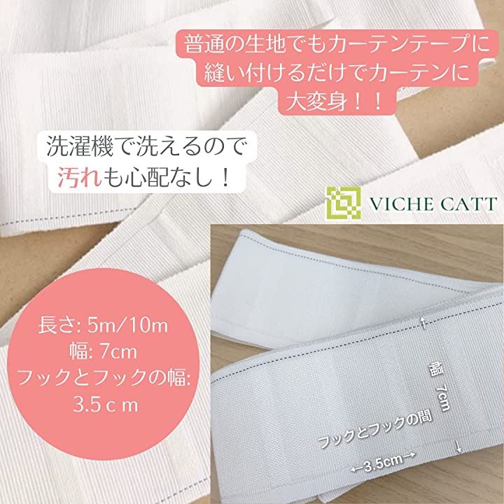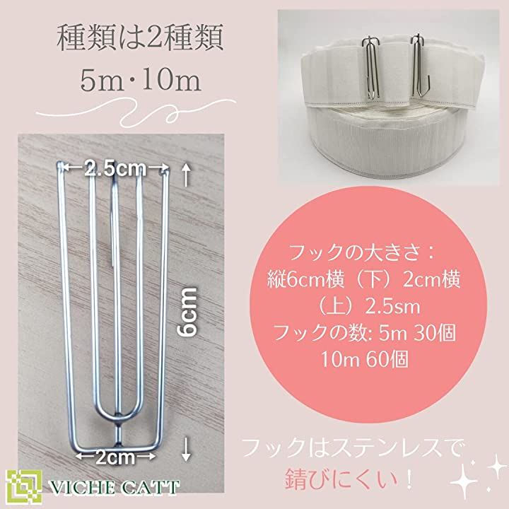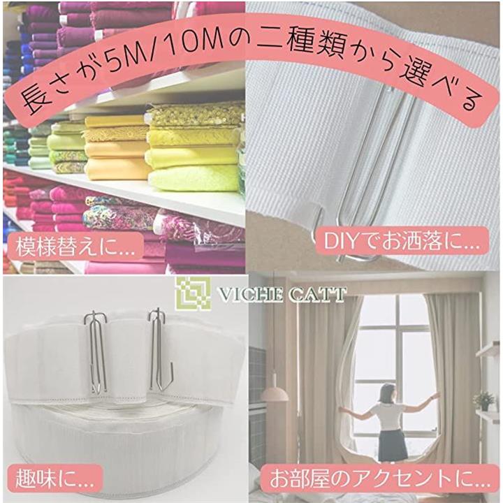 ・「サイズ」 長さ:5mx幅7cm/10mx幅7cm フックとフックの幅:3,5cm バリエーション:5m フック30個/10m フック60個 色:ホワイト 素材:ポリエステル 使用例:カーテンの柄を自分で選びたい時や装飾したい時に自分で簡単にアレンジできます。