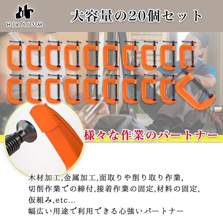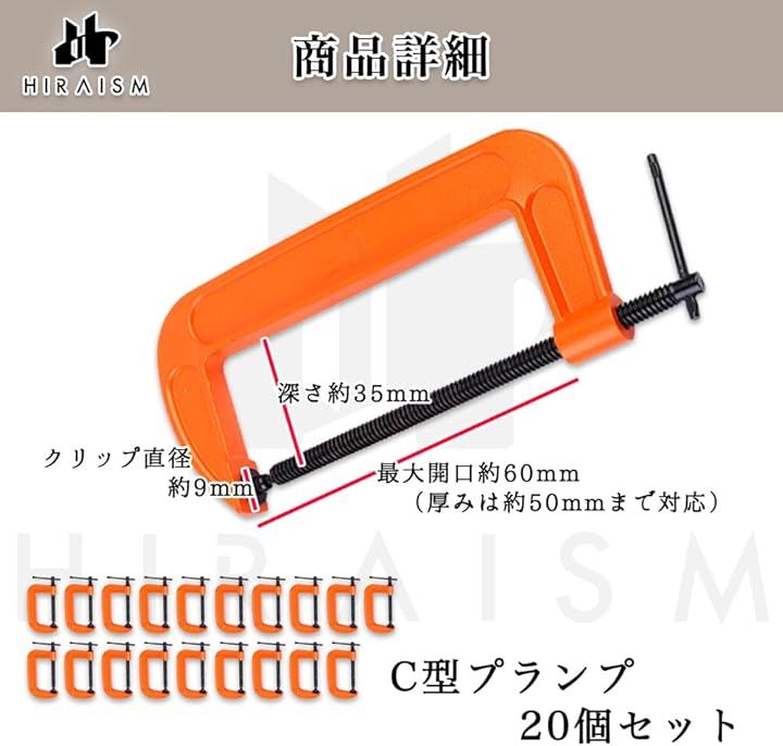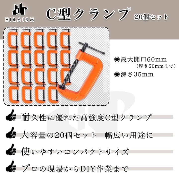 シャコ万力 C型クランプ 強力 鋼製 50mm 小型 DIY 20個セット 開口60mm 厚さ50mmまで対応可