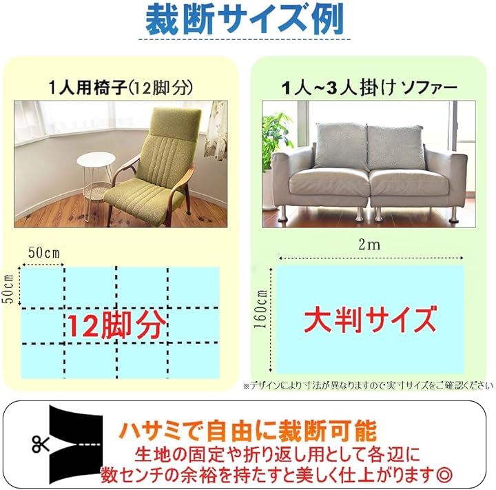 「幅160cmたっぷり使える 大きいサイズ*」大きめサイズでソファ3人掛け、椅子 約12脚分も使用できるビッグサイズで家中のリメイク、補修に使用可能です。
