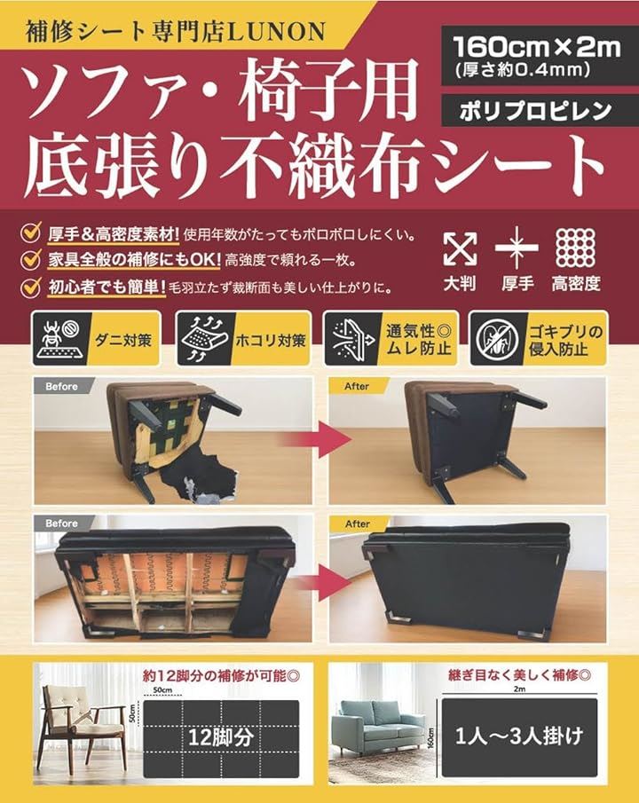 「ソファ内部のホコリ、ダニ対策に効果大*」ソファ内部には、湿気がたまりやすく、ホコリ、ゴミ、ダニなどがたくさん。ガンタッカーの道具があれば、簡単に張替えが可能なので、ソファ内部を丸ごとスッキリ掃除して清潔で快適なリラックス空間を手に入れてください*ご家庭のハサミで自由自在にカット、カスタマイズが可能です*