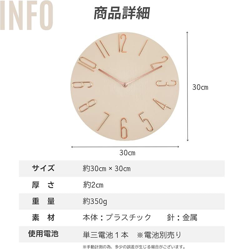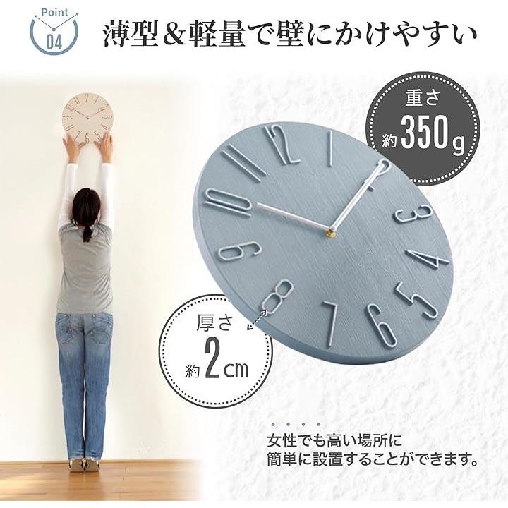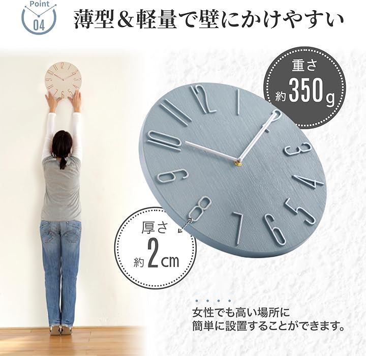 「薄型&軽量で取り付け簡単」 この掛け時計は、薄型かつ軽量で、女性でも簡単に取り付けることができます。
