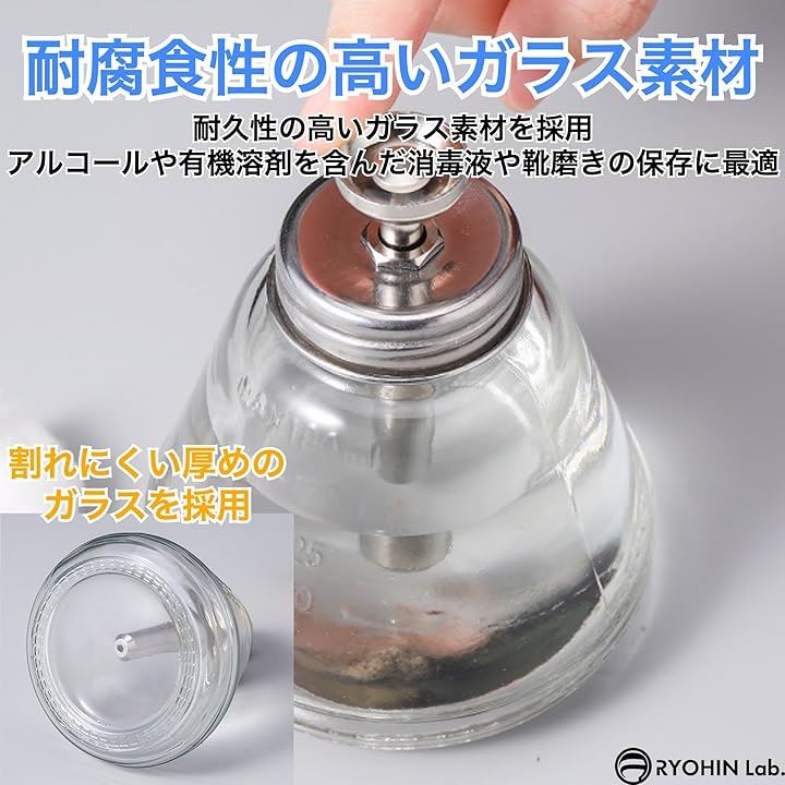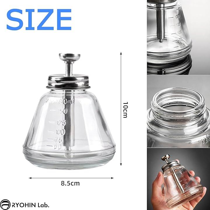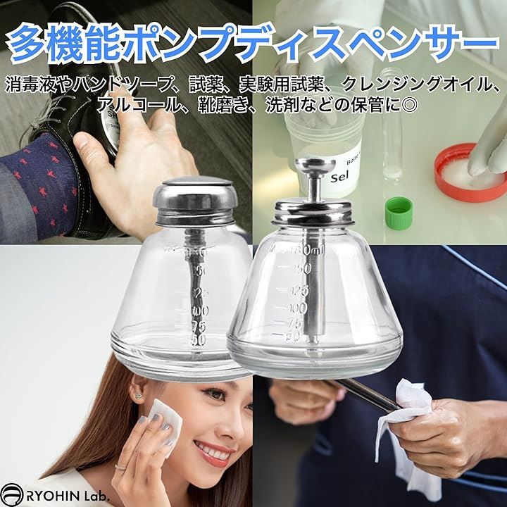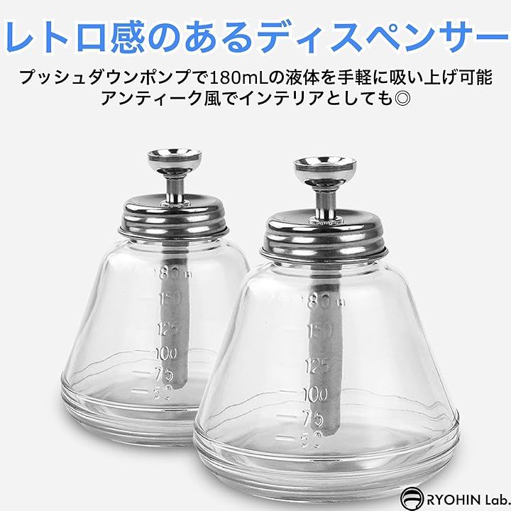 良品ラボ プッシュダウンポンプ ディスペンサー ガラス容器 ガラスポンプ 耐薬品性 液体保存 レトロ 目盛り付き 180mL 1個