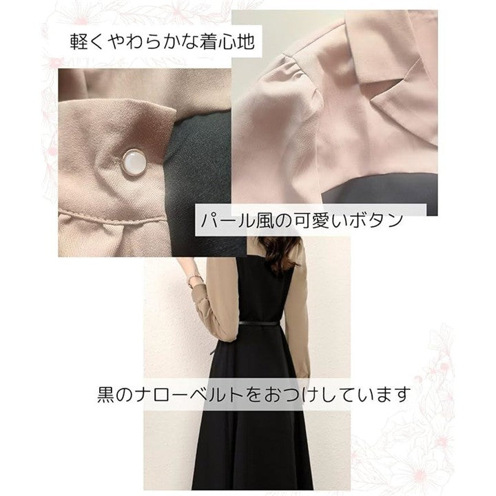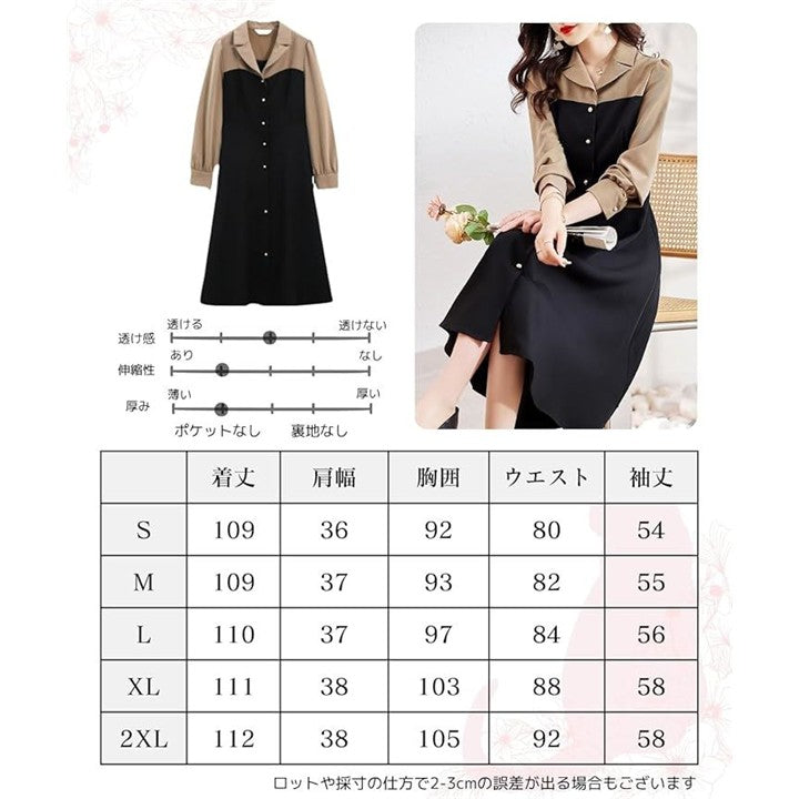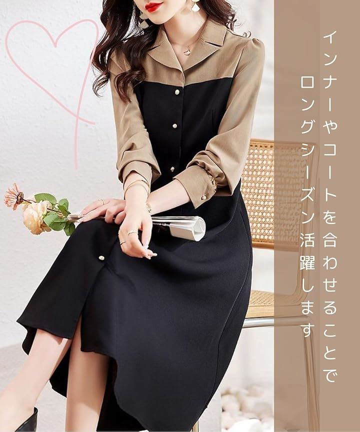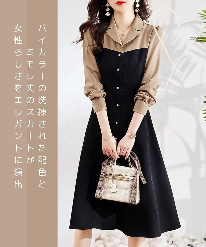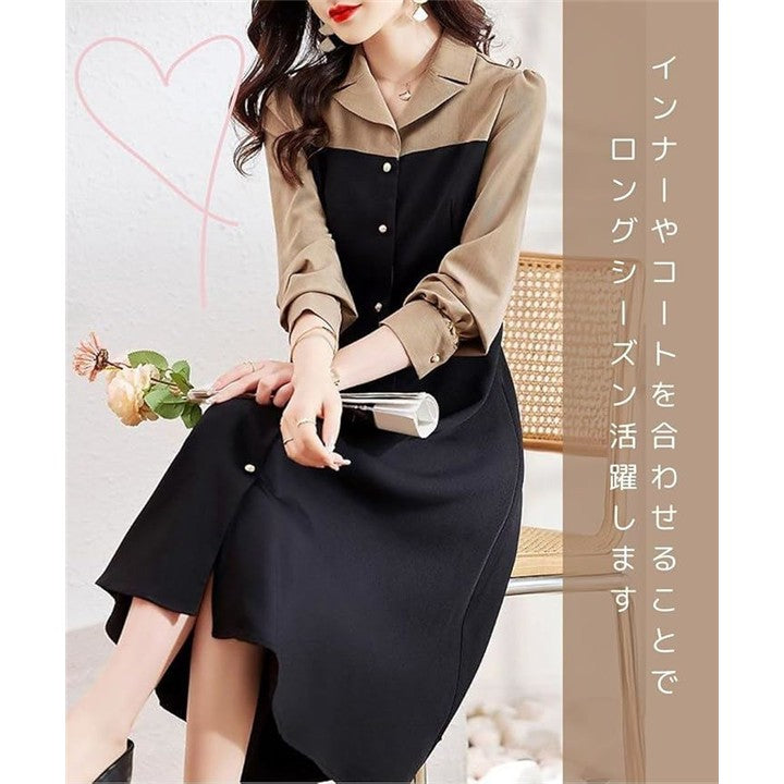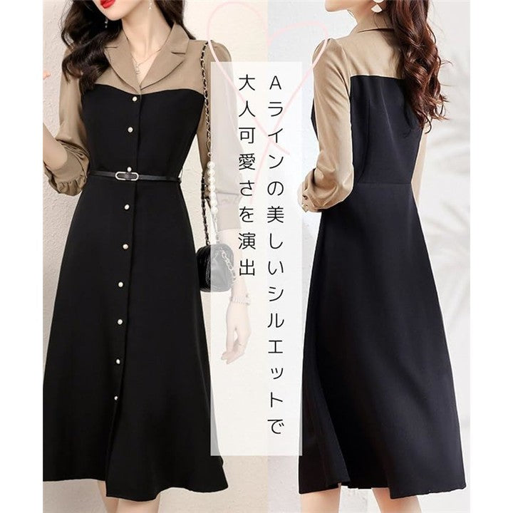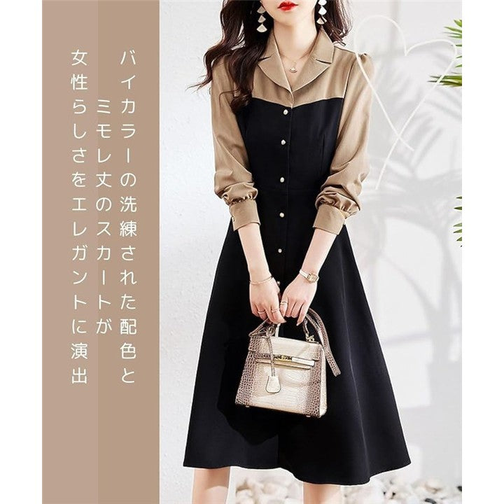 モワレフワンピース レディース きれいめ 春 Aライン 長袖 可愛い 上品 膝下丈 バイカラー
