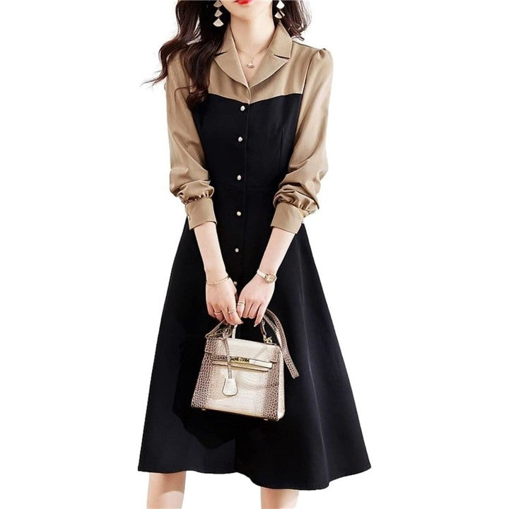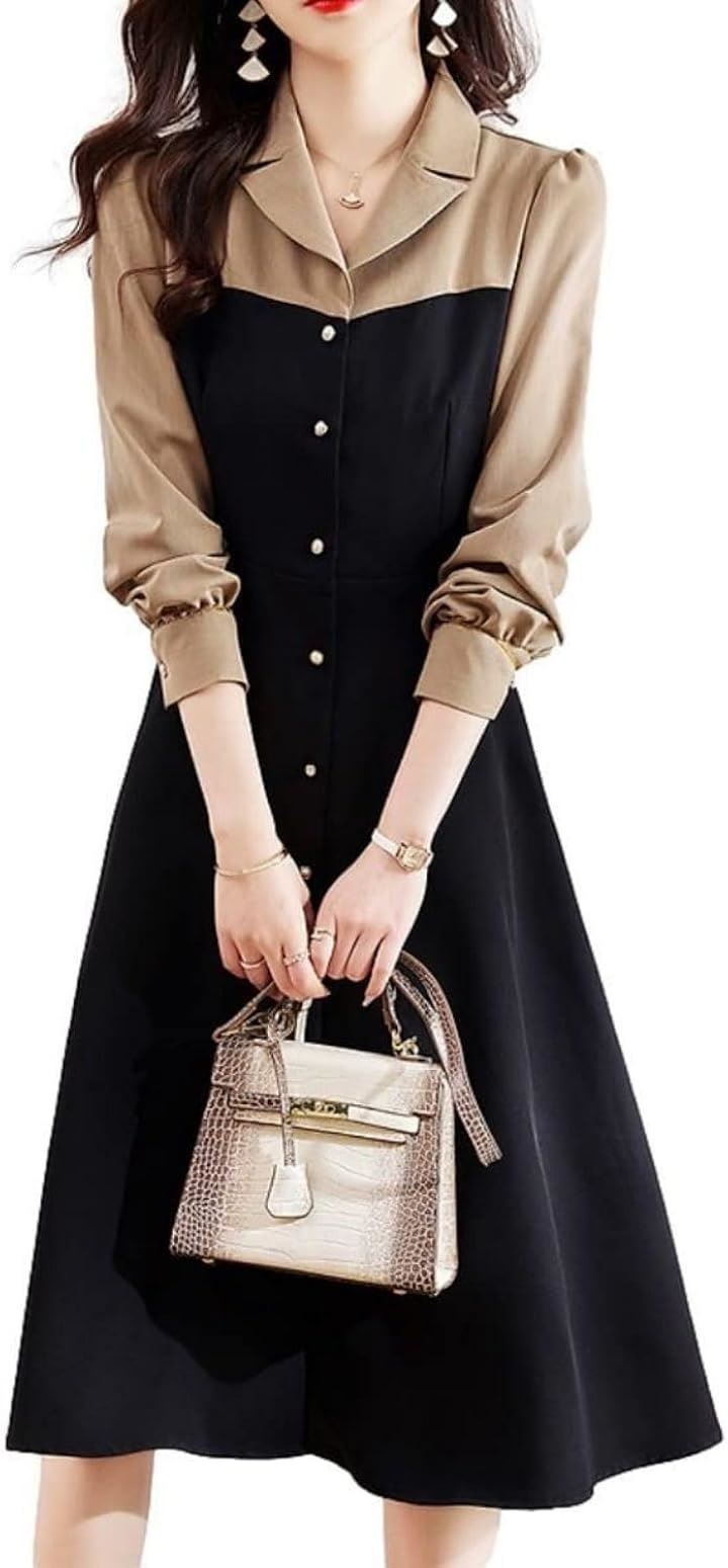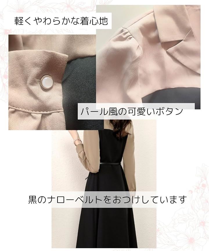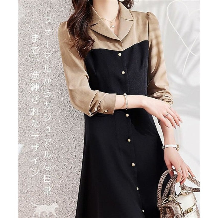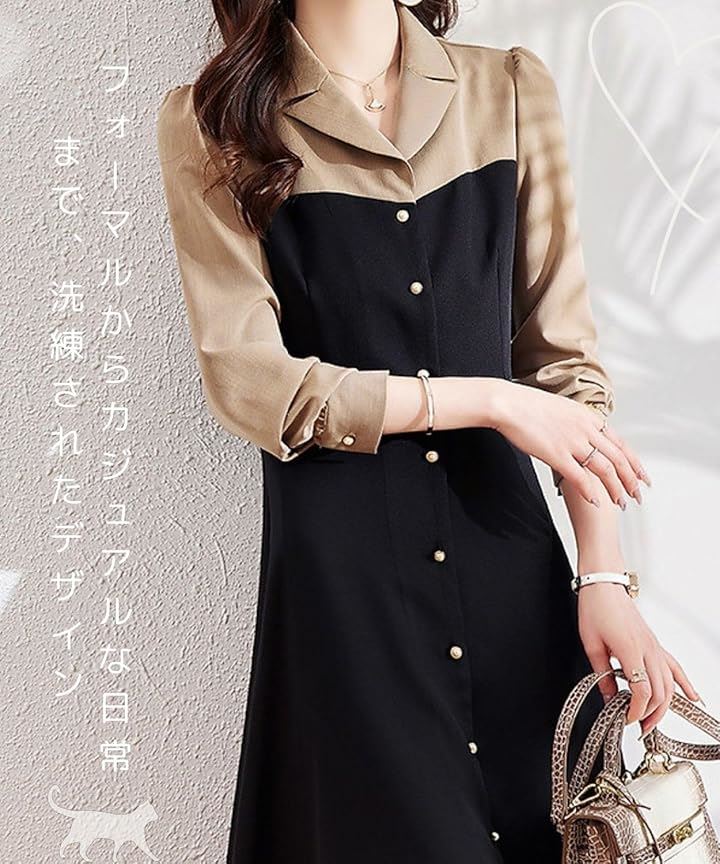 モワレフワンピース レディース きれいめ 春 Aライン 長袖 可愛い 上品 膝下丈 バイカラー