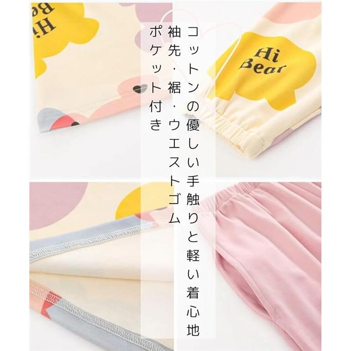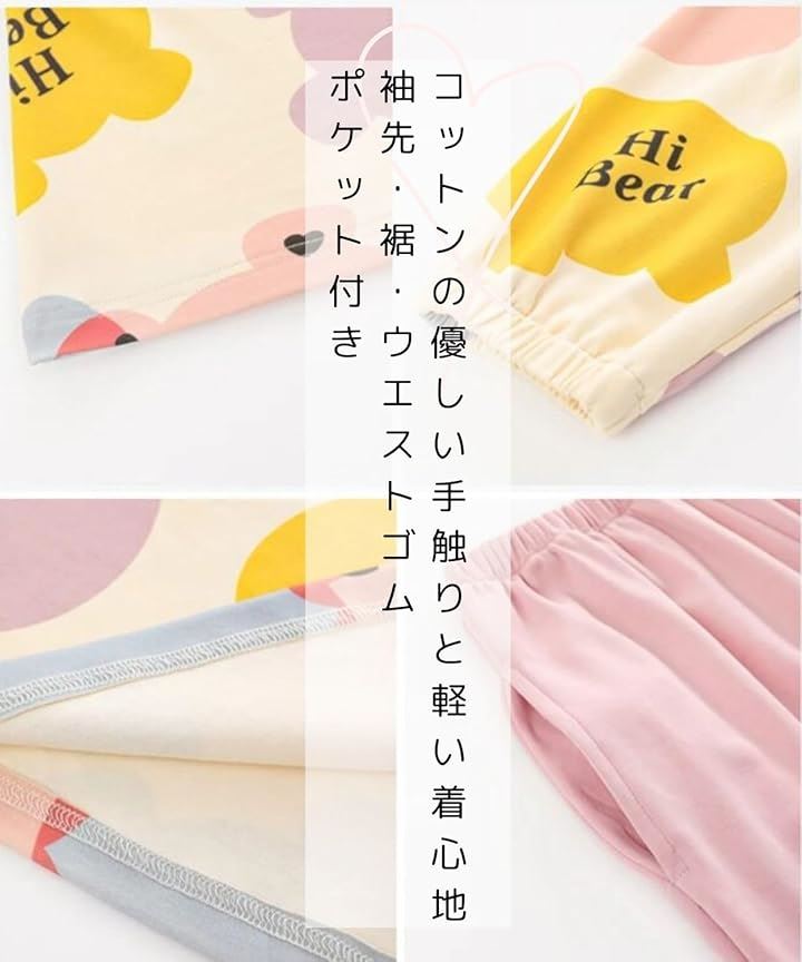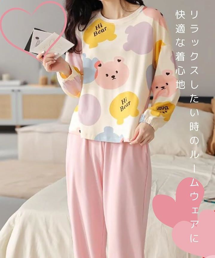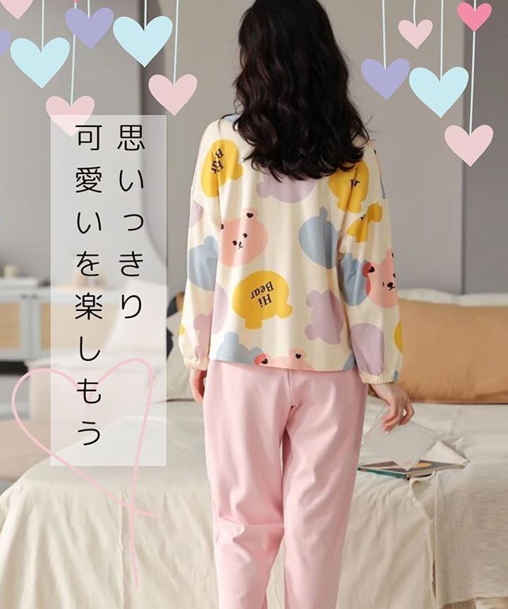 「可愛いデザインのおしゃれパジャマ」袖口のリボンや可愛いプリント柄で女性らしい雰囲気を演出。
