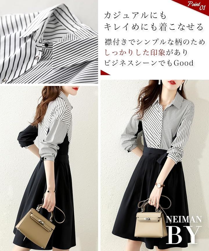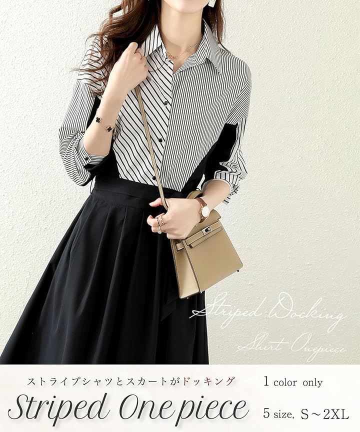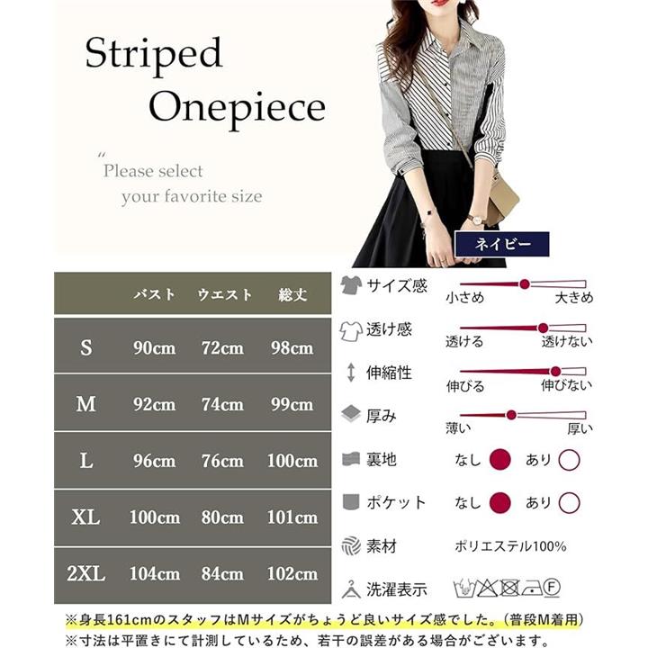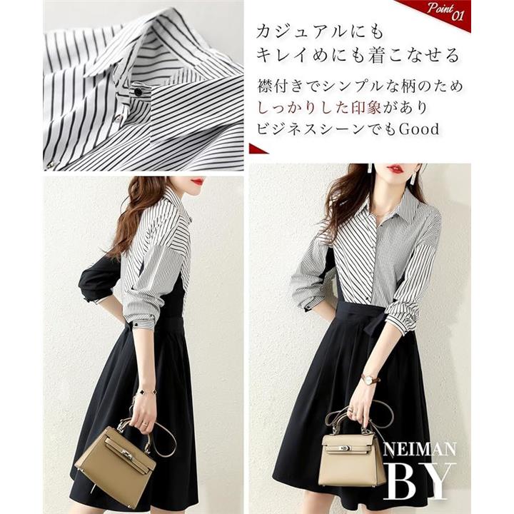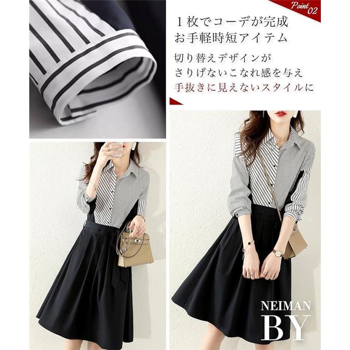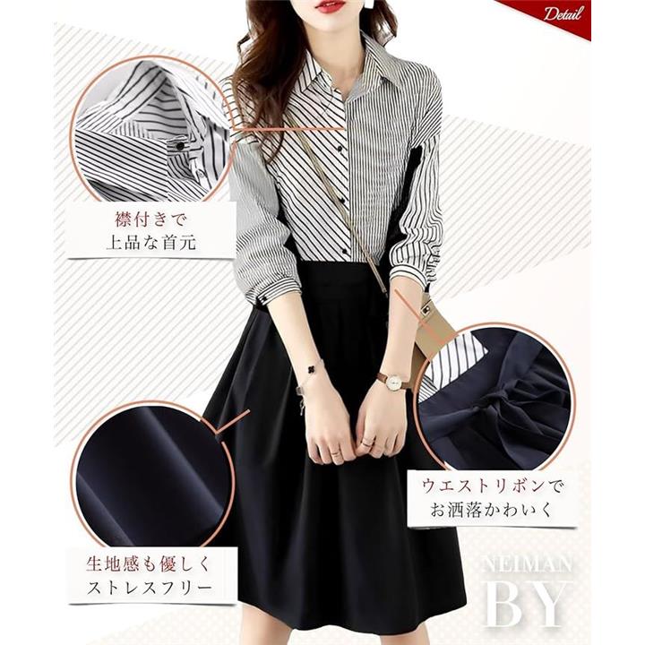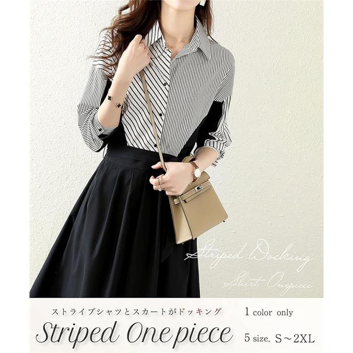 ストライプ ドッキング ワンピース レディース 長袖 膝丈 フレアー シャツ カジュアル オフィス フォーマル風 きれいめワンピース ストライプシャツ 二の腕カバー セレモニー コーデ エレガント 綺麗 セクシー ダンス 演奏会 お宮参り