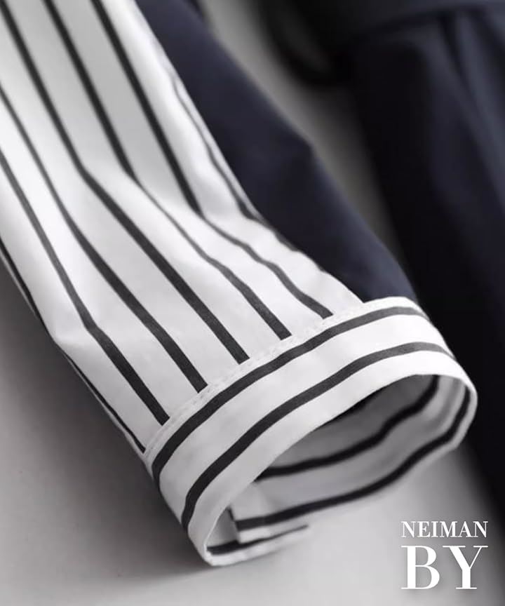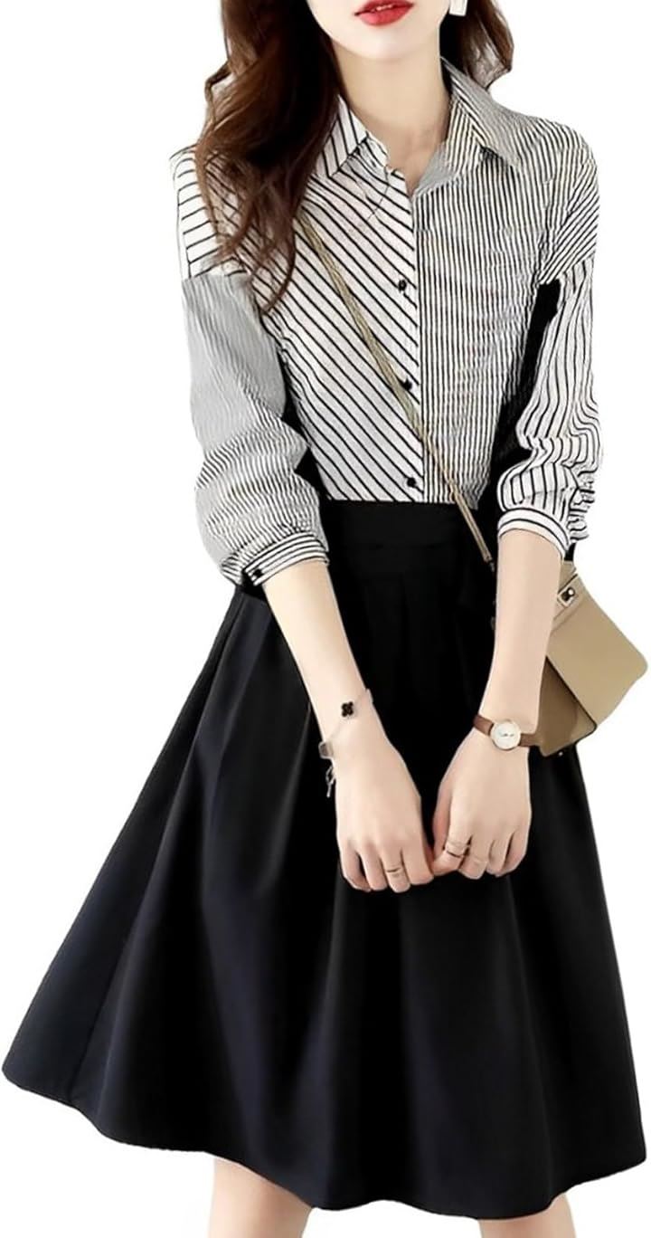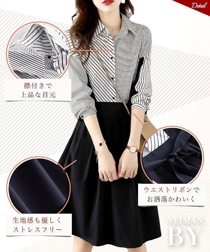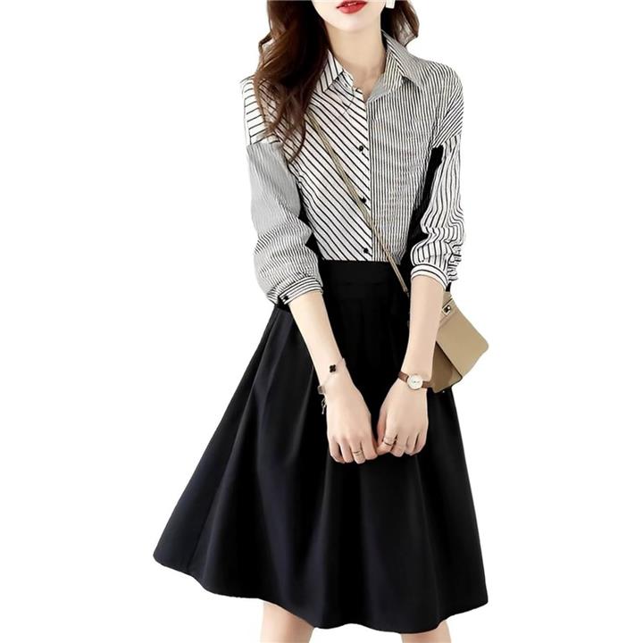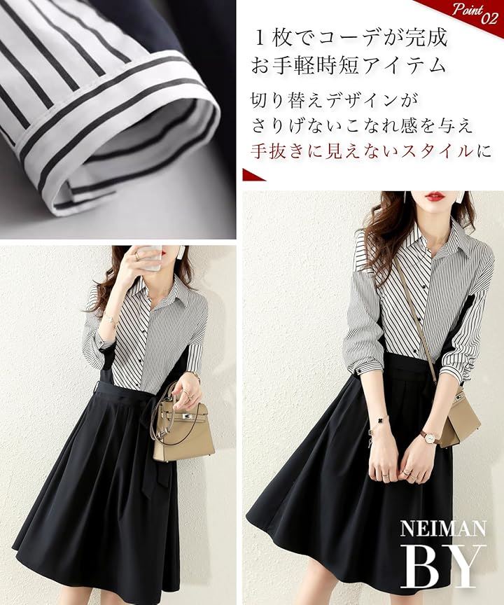 ストライプ ドッキング ワンピース レディース 長袖 膝丈 フレアー シャツ カジュアル オフィス フォーマル風 きれいめワンピース ストライプシャツ 二の腕カバー セレモニー コーデ エレガント 綺麗 セクシー ダンス 演奏会 お宮参り