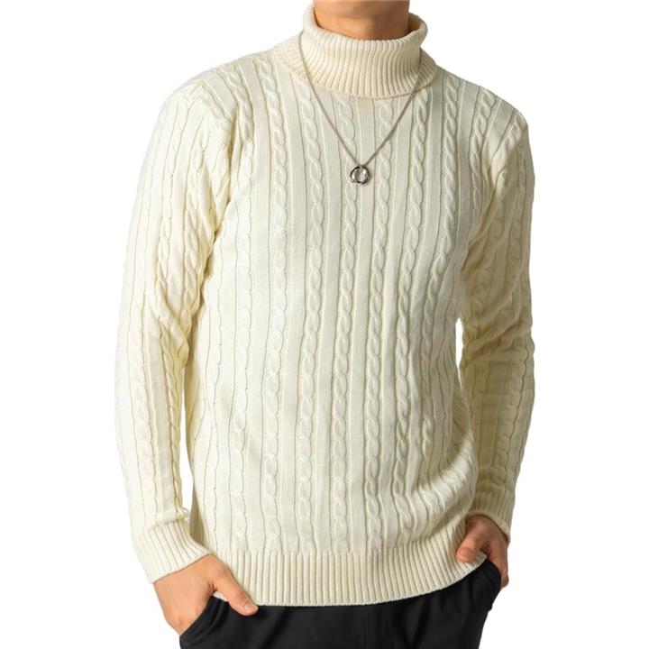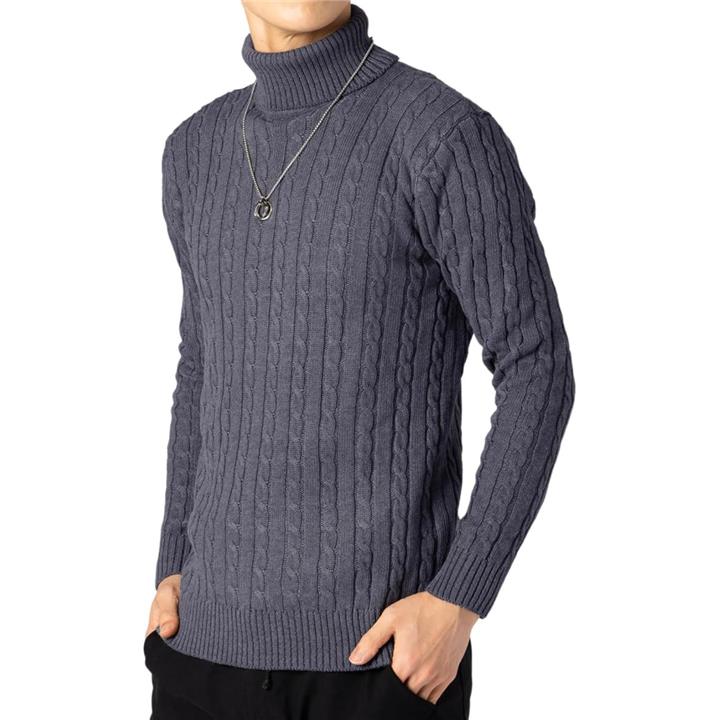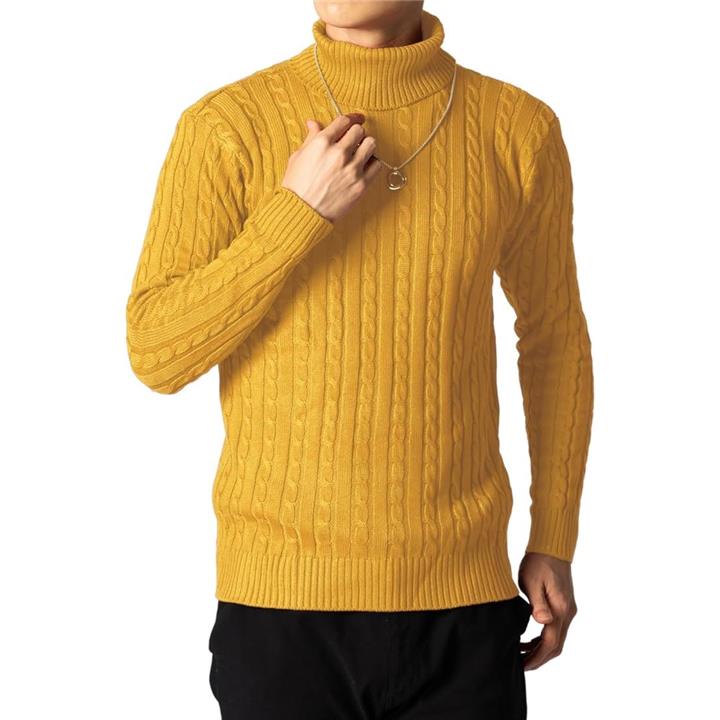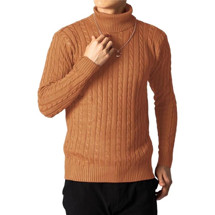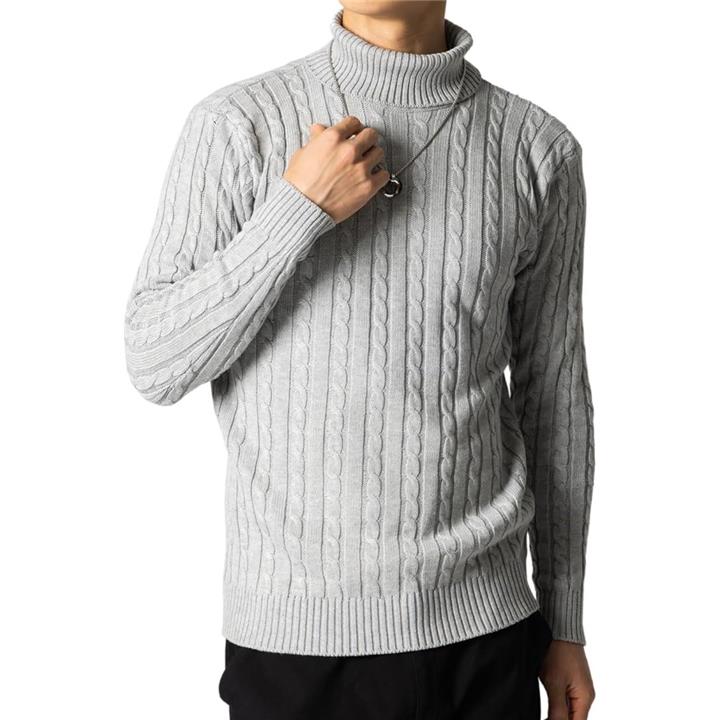 「上品さとスタイリッシュさを兼ね備えた」高いデザイン性とスリムなシルエットが特徴のケーブル編みニットタートルネックセーター。