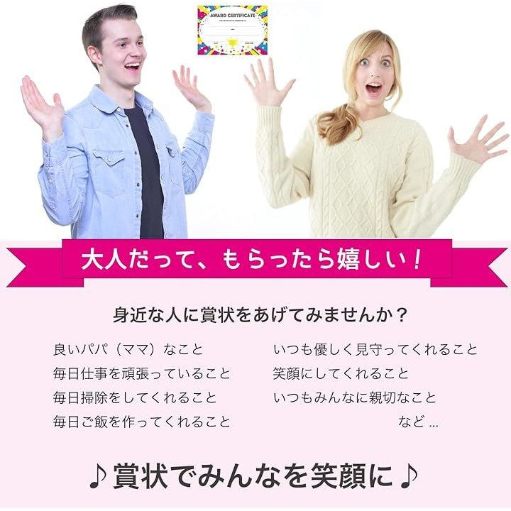 お礼や感謝の気持ちを伝える時も、この賞状をつけてあげるだけで、伝わり方がグレードアップ。あなたなりの使い方で、周りの人を喜ばせてみませんか?