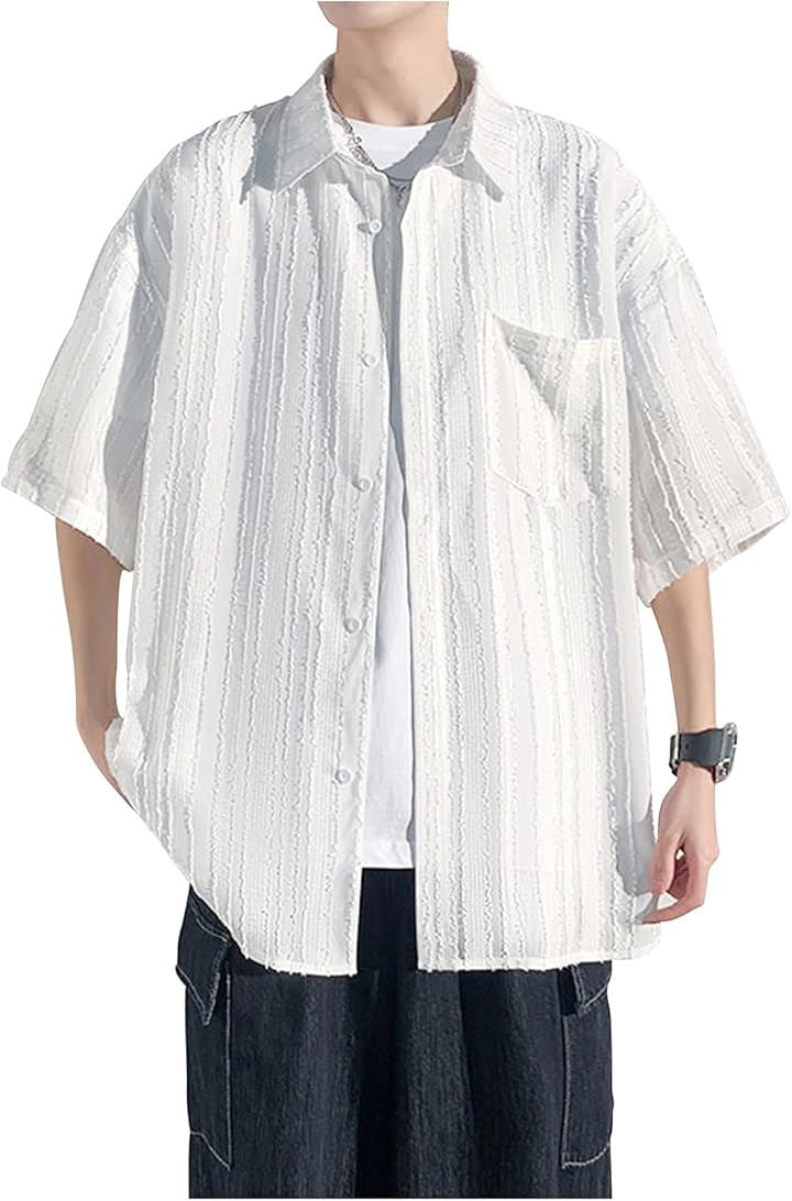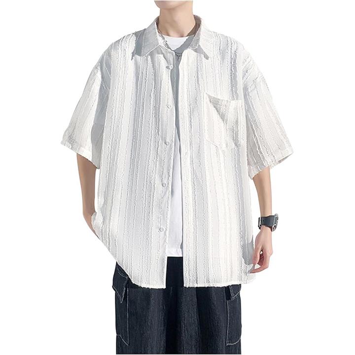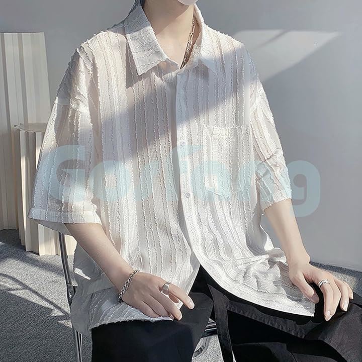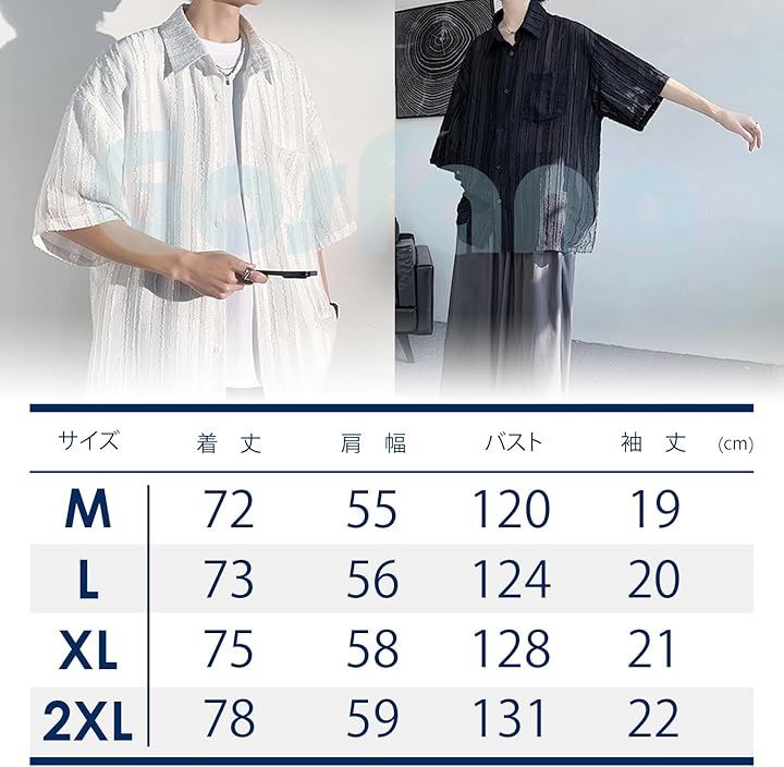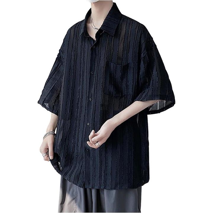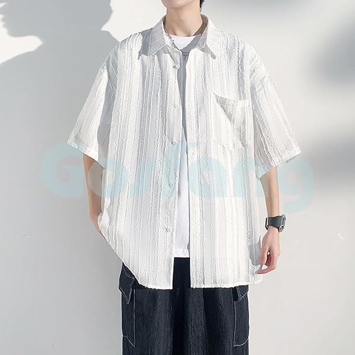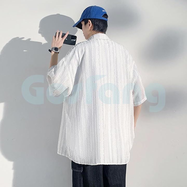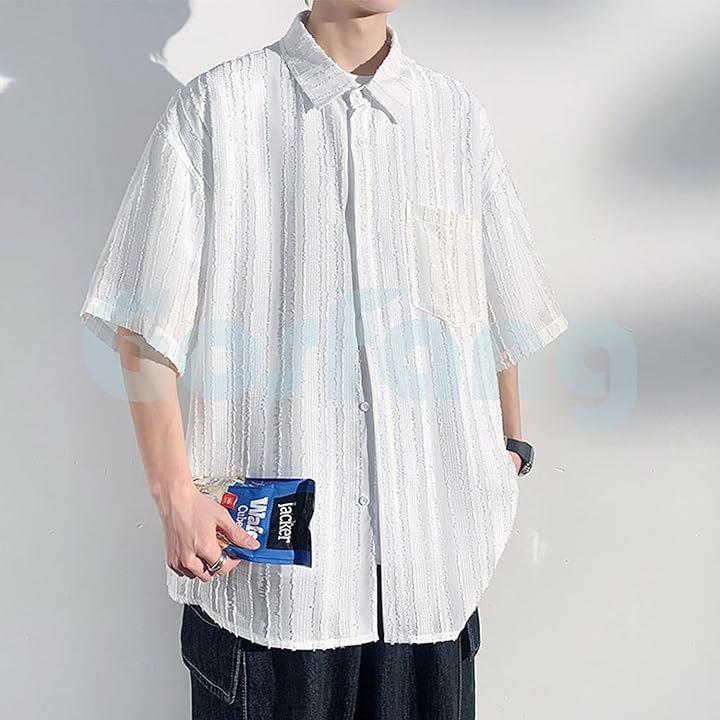メンズ シャツ 半袖 春 夏 ゆったり 大きい ひんやり 接触冷感 シアー ストライプ ポケット付き カジュアル