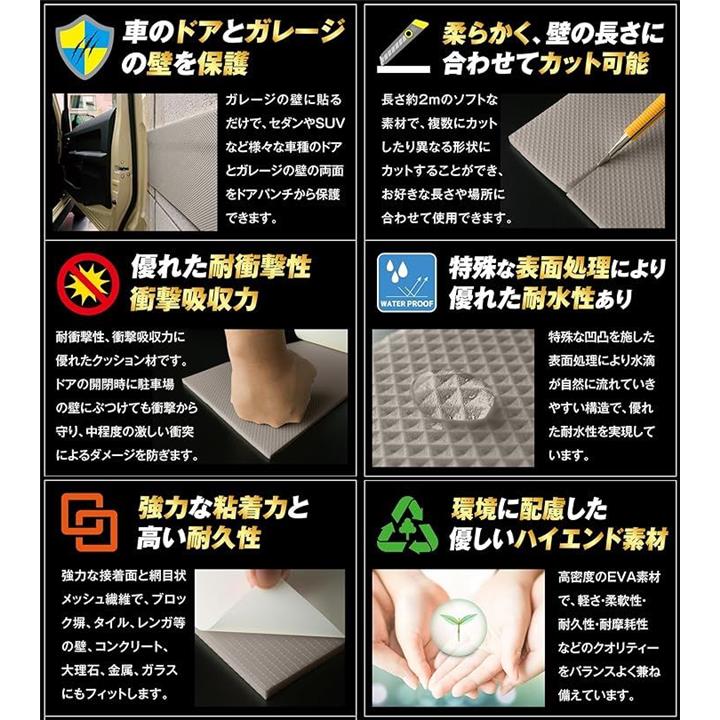 「厚さ 9mmの高密度 衝撃吸収材」この駐車場 クッションは車庫の壁に貼るだけで様々な車種のドアをドアパンチから保護します。