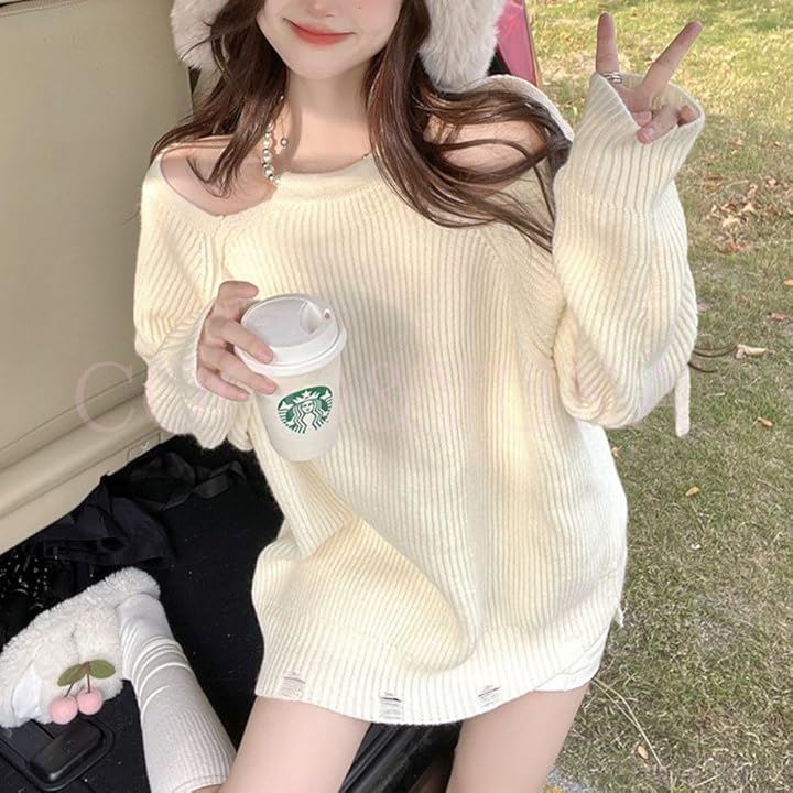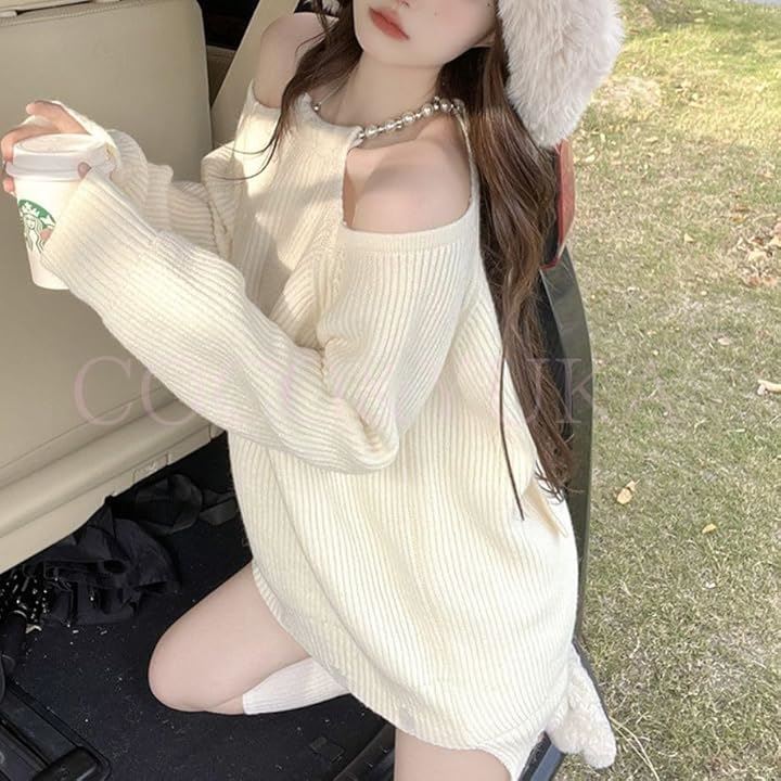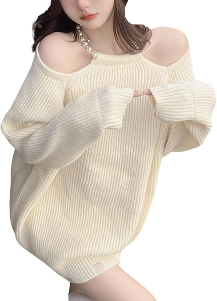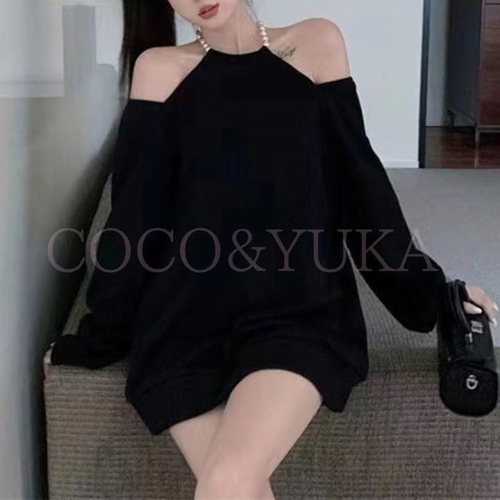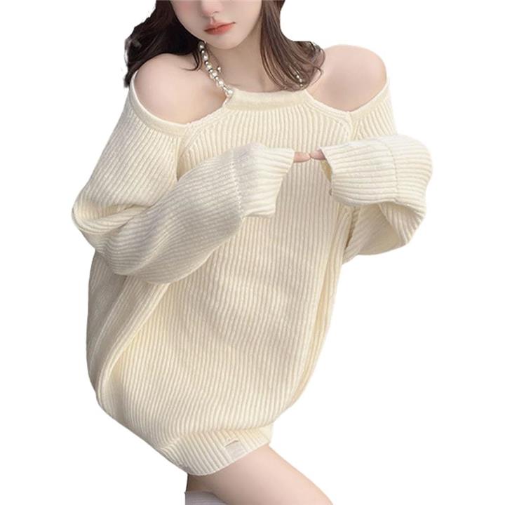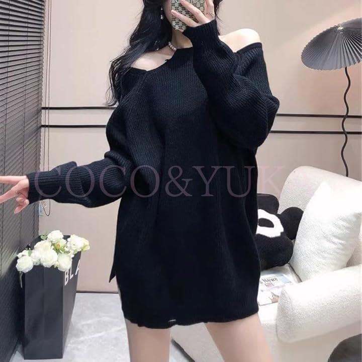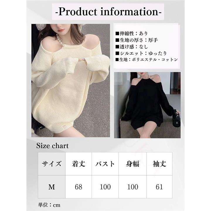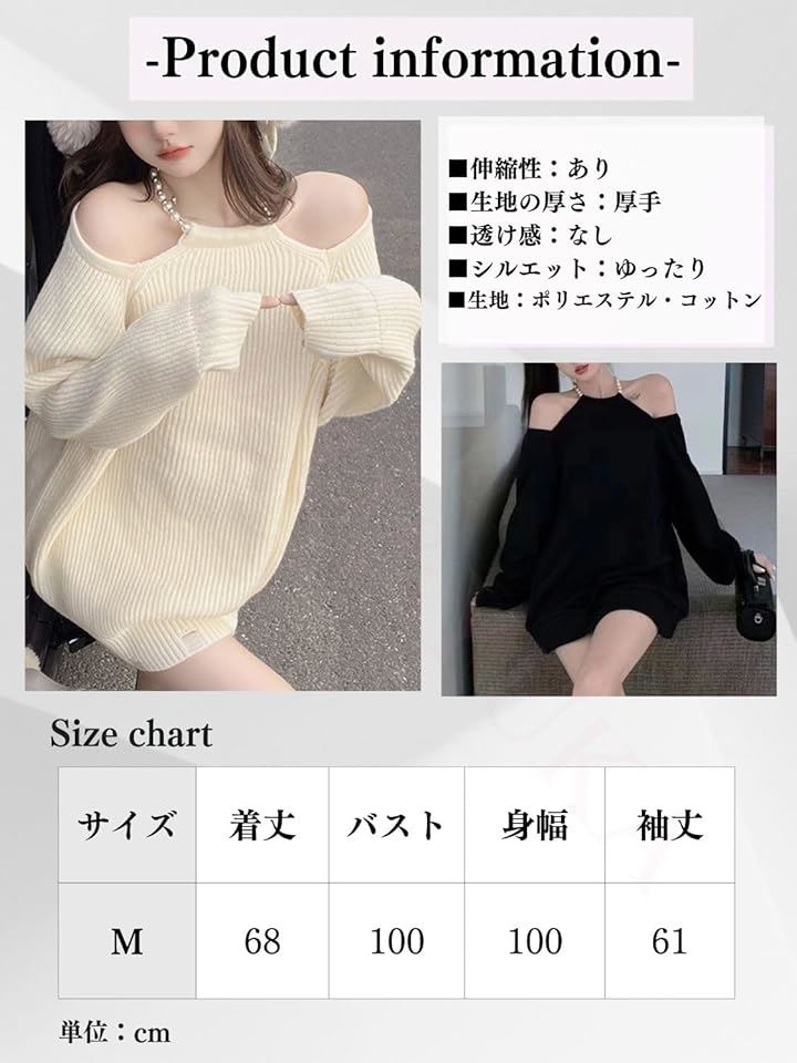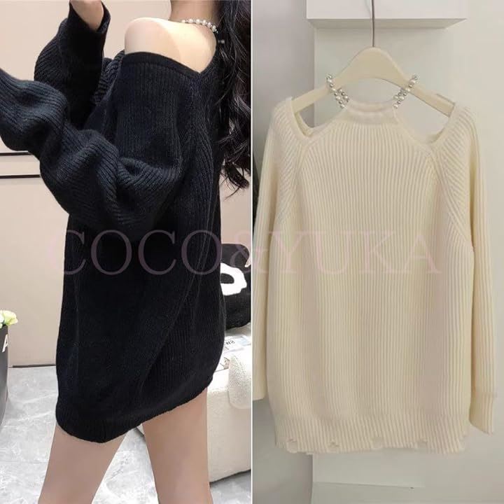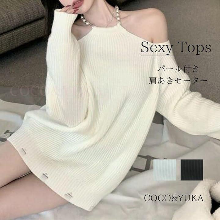 肩出し セーター ニット ミニ ワンピース トップス 長袖 ゆったり セクシー チュニック オフショルダー かわいい ダメージ 無地 レディース パール 付き