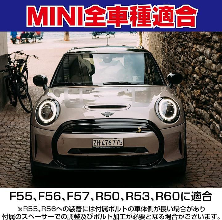 「MINI全車種適合」F55、F56、F57、R50、R53、R60に適合。