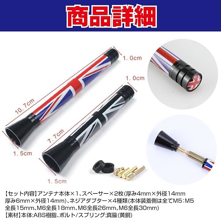 「セット内容」アンテナ本体x1、スペーサーx2枚(厚み4mmx外径14mm、厚み6mmx外径14mm)、ネジアダプターx4種類(本体装着側は全てM5:M5全長15mm、M6全長18mm、M6全長26mm、M6全長30mm) 「素材」本体:ABS樹脂、ボルト/スプリング:真鍮(黄銅)