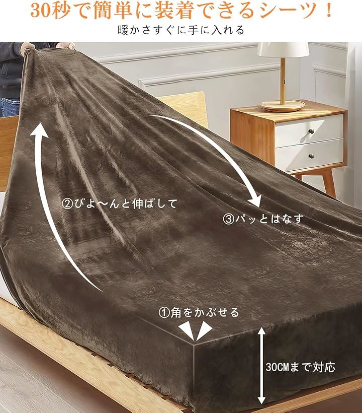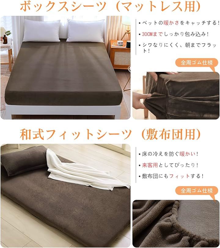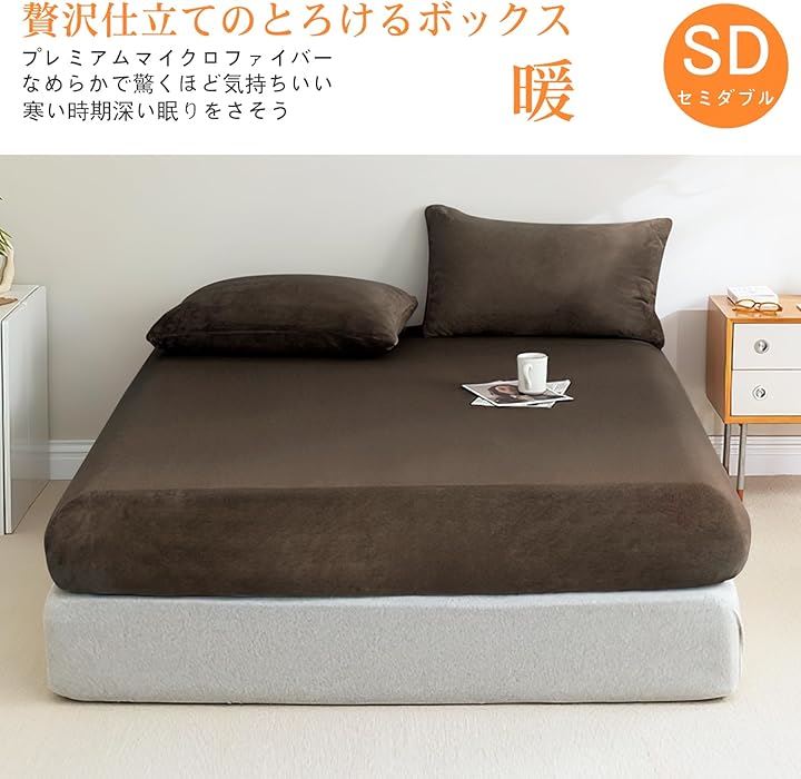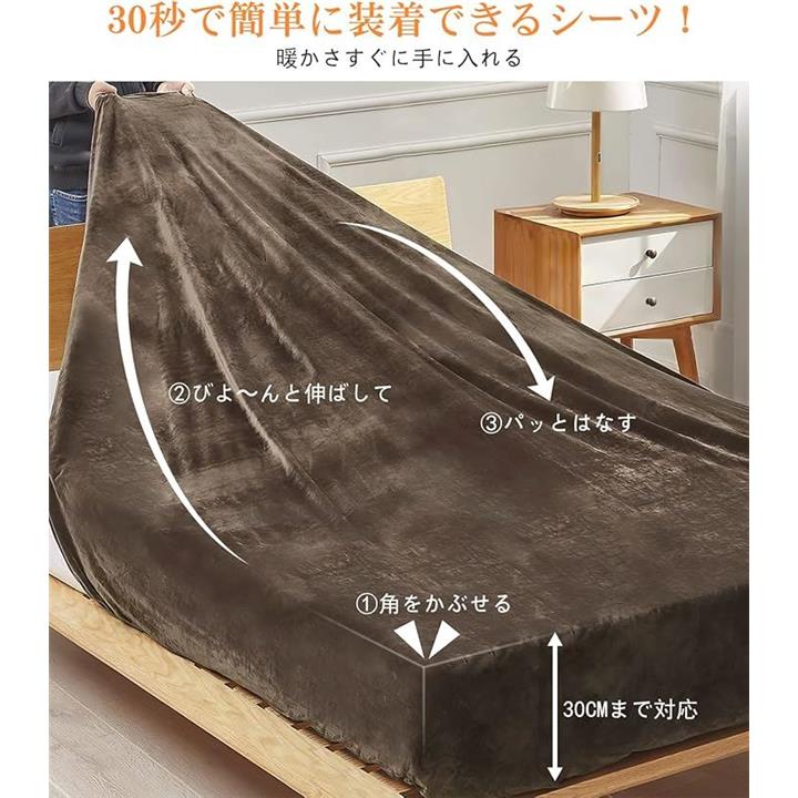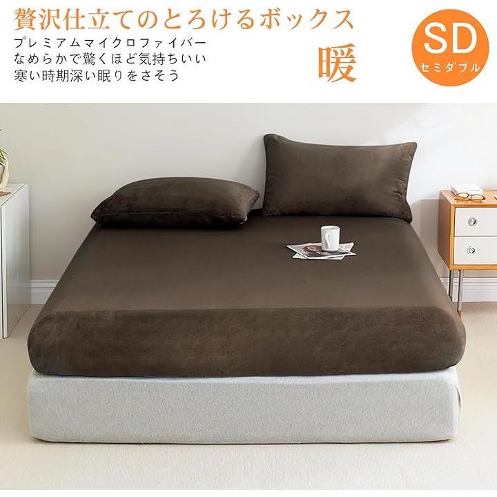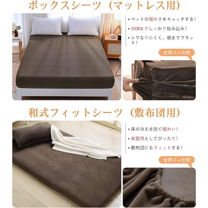 ボックスシーツがシングル 100x200cm・セミダブル 120x200cm でマチ部分約 30cm、ベッドカバーは極細繊維が空気を保持して暖かく繊維密集で柔らかくシルクのような肌触りと光沢があるフランネル生地で、敷き布団カバーは裏面全周ゴム入りでズレにくくストレッチ性で着脱簡単且つマットレスや和式布団、極厚敷布団に対応し、静電気防止加工で秋冬も安心使用でき、家庭で洗濯可能で清潔なふわふわ触感を楽しめる(但し洗濯機使用時はネットに入れ、乾燥機不使用、塩素系漂白剤使用避け)ものです。